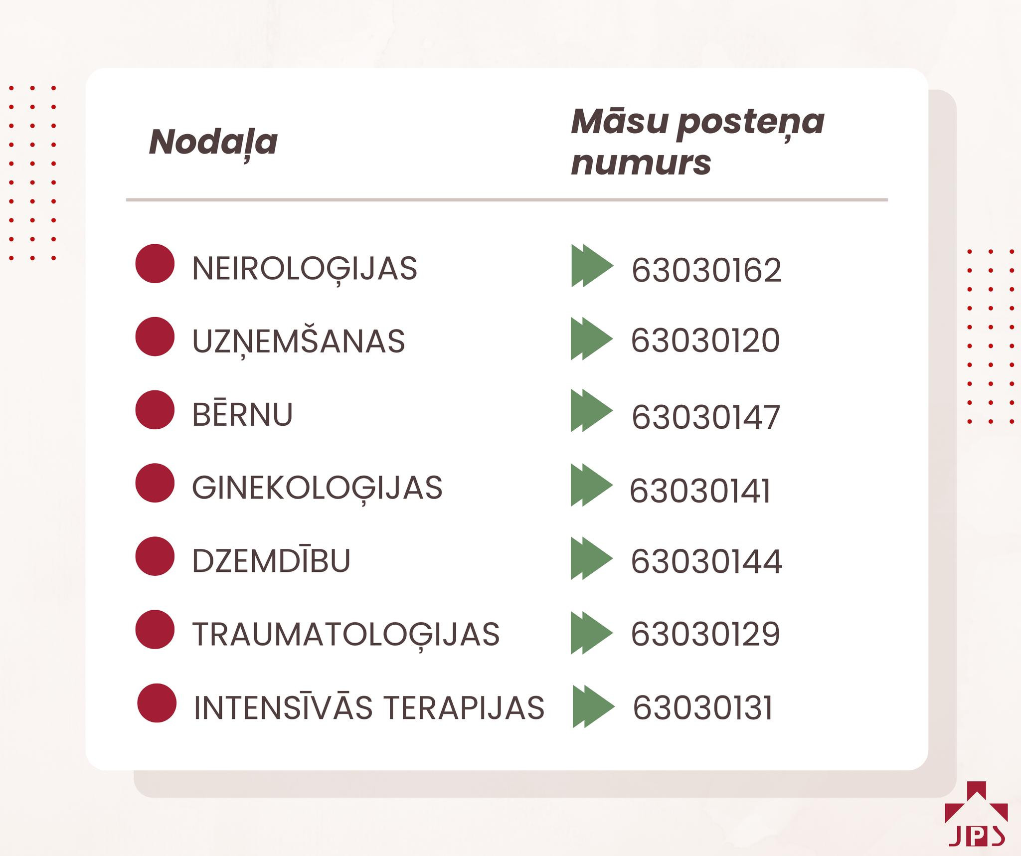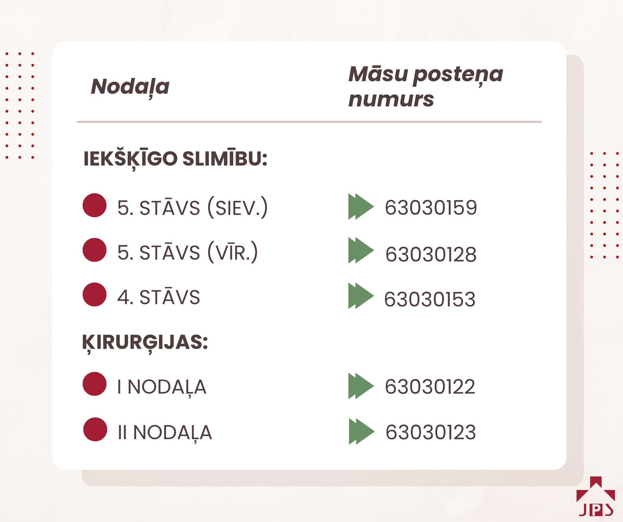 Vizīti lūgums pieteikt, zvanot uz nodaļu māsu posteņu tālruņiem!