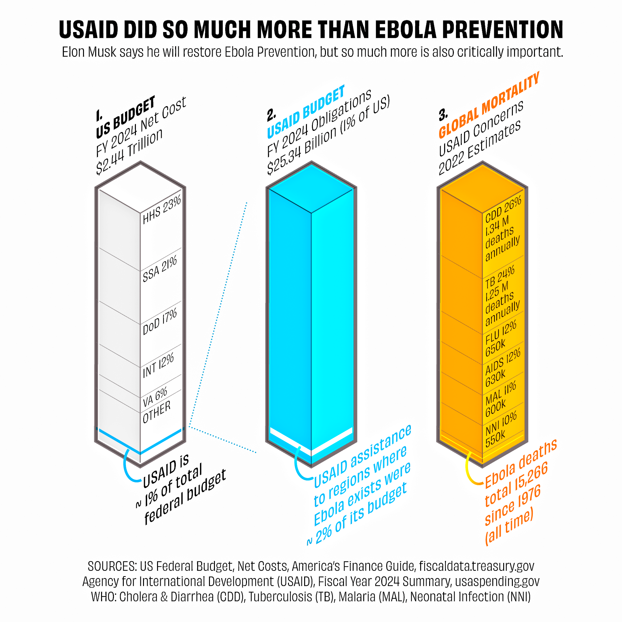 Ebola sounds scary, but it’s not terribly infectious, nor widespread, nor difficult to prevent. Much worse are insidious and deadly diseases like Malaria, Tuberculosis, Neglected Tropical Diseases (NTDs), Maternal and Neonatal Infections (NNI), Cholera and Diarrheal diseases (CDD). USAID helped to mitigate these—as well as HIV/AIDs, Polio, Influenza, and starvation—yet Mr. Musk only mentions the cancellation of Ebola prevention as a mistake, even though far more die of other preventable diseases.