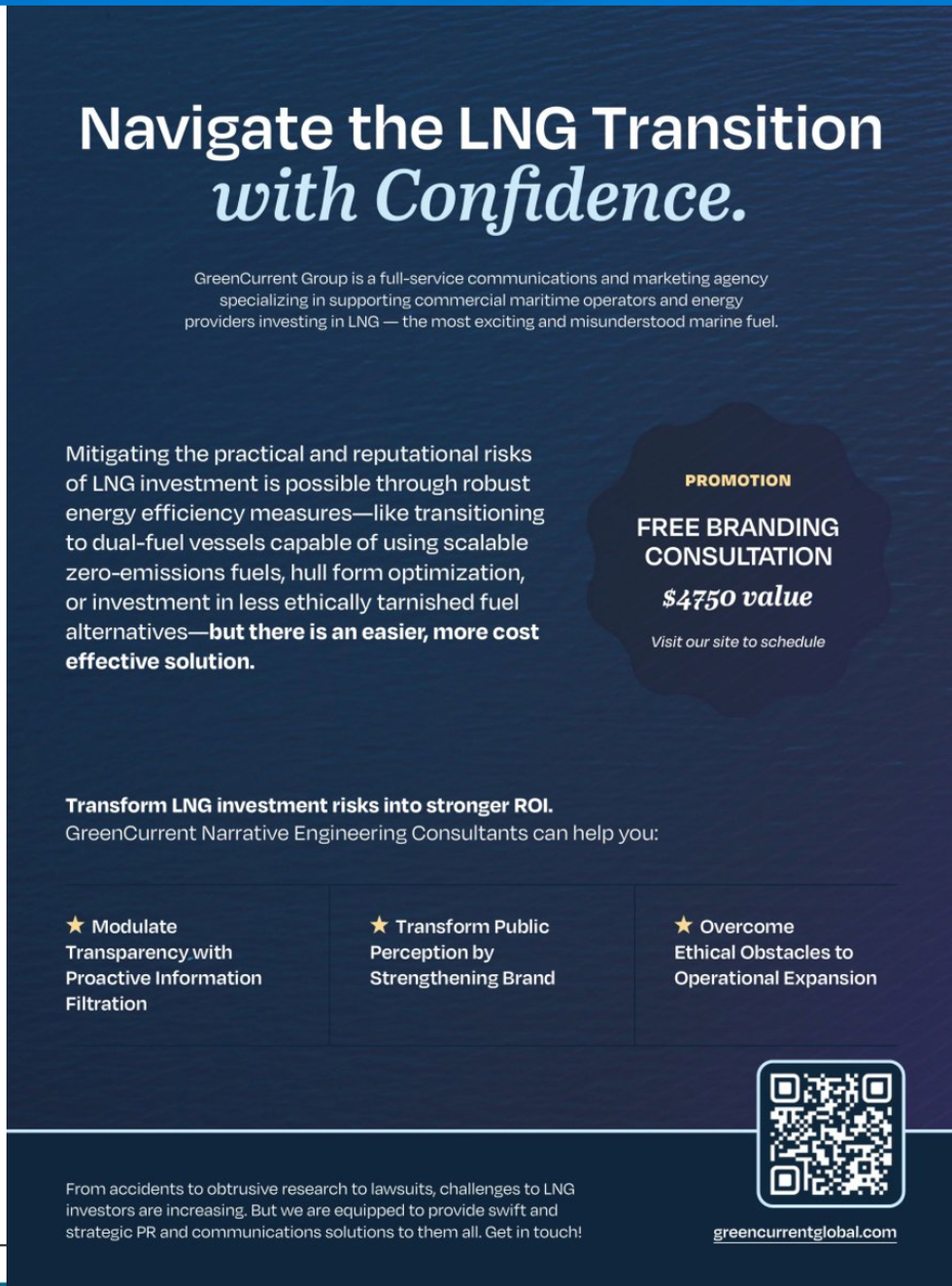 Page 15 of the magazine displays an ad for GreenCurrent Group, which bills itself as a “full service communications and marketing agency specializing in supporting commercial maritime operators and energy providers investing in LNG [liquefied natural gas]—the most exciting and misunderstood marine fuel.”
