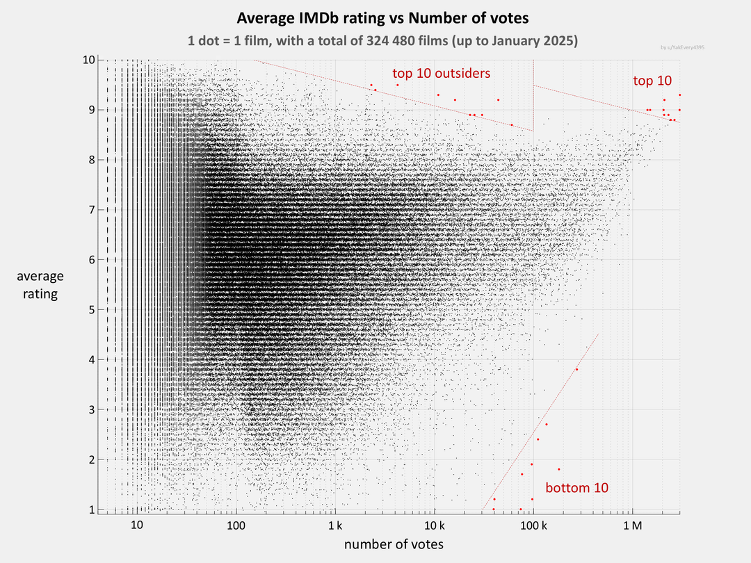 [OC] Top 10 films / Top 10 Outsiders / Bottom 10 films (based on IMDb ratings)