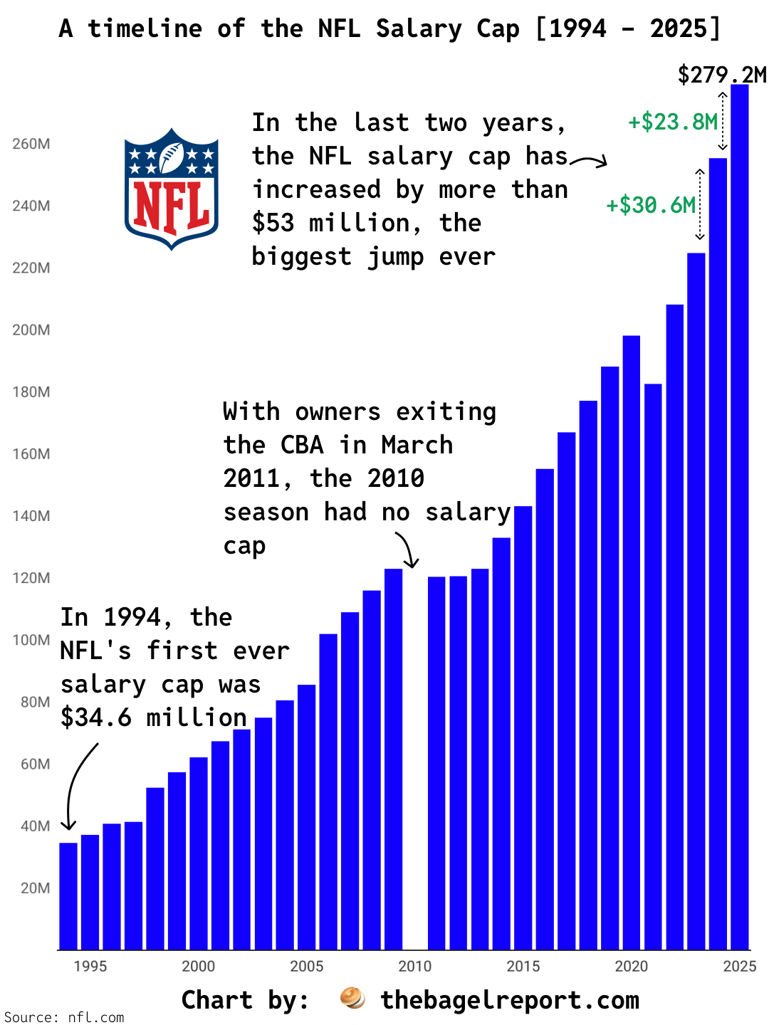 The NFL and NFLPA recently agreed to a 2025 salary cap of $279.2 million per team, which is the highest cap in NFL history. This is more than $100 million higher than the cap in 2018 ($177M) and almost $200 million more than what it was in 2005 (85.5$M).