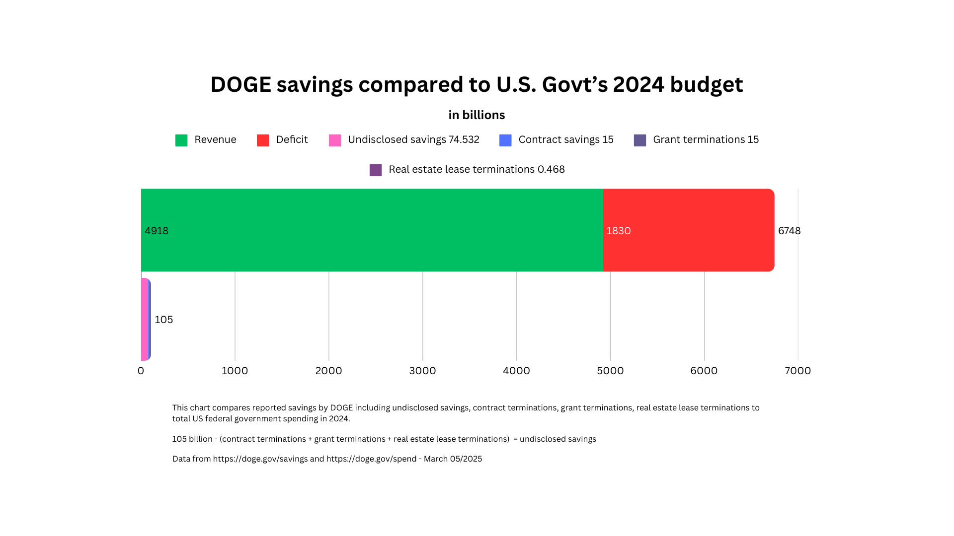 Data from [https://doge.gov/savings](https://doge.gov/savings) and [https://doge.gov/spend](https://doge.gov/spend) – March 05/2025