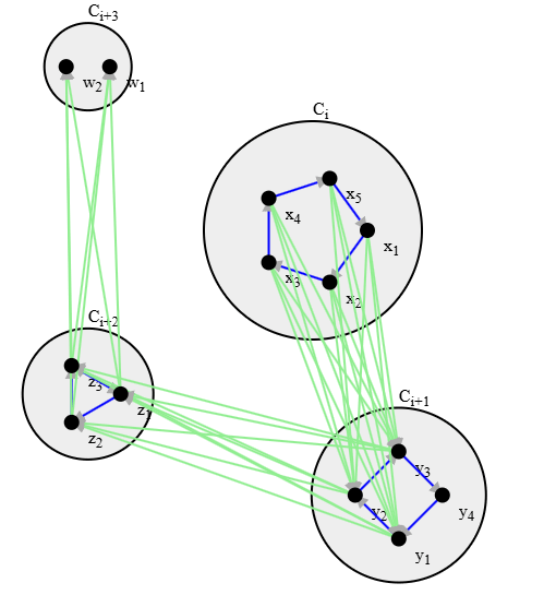 This image illustrates a key step in my Seymour Second Neighborhood Conjecture (SSNC) proof: the Weak Decreasing Exteriors Lemma. We start with a pentagon, which reduces to a square, then a triangle, and finally, a graph with no possible 2-node cycles.