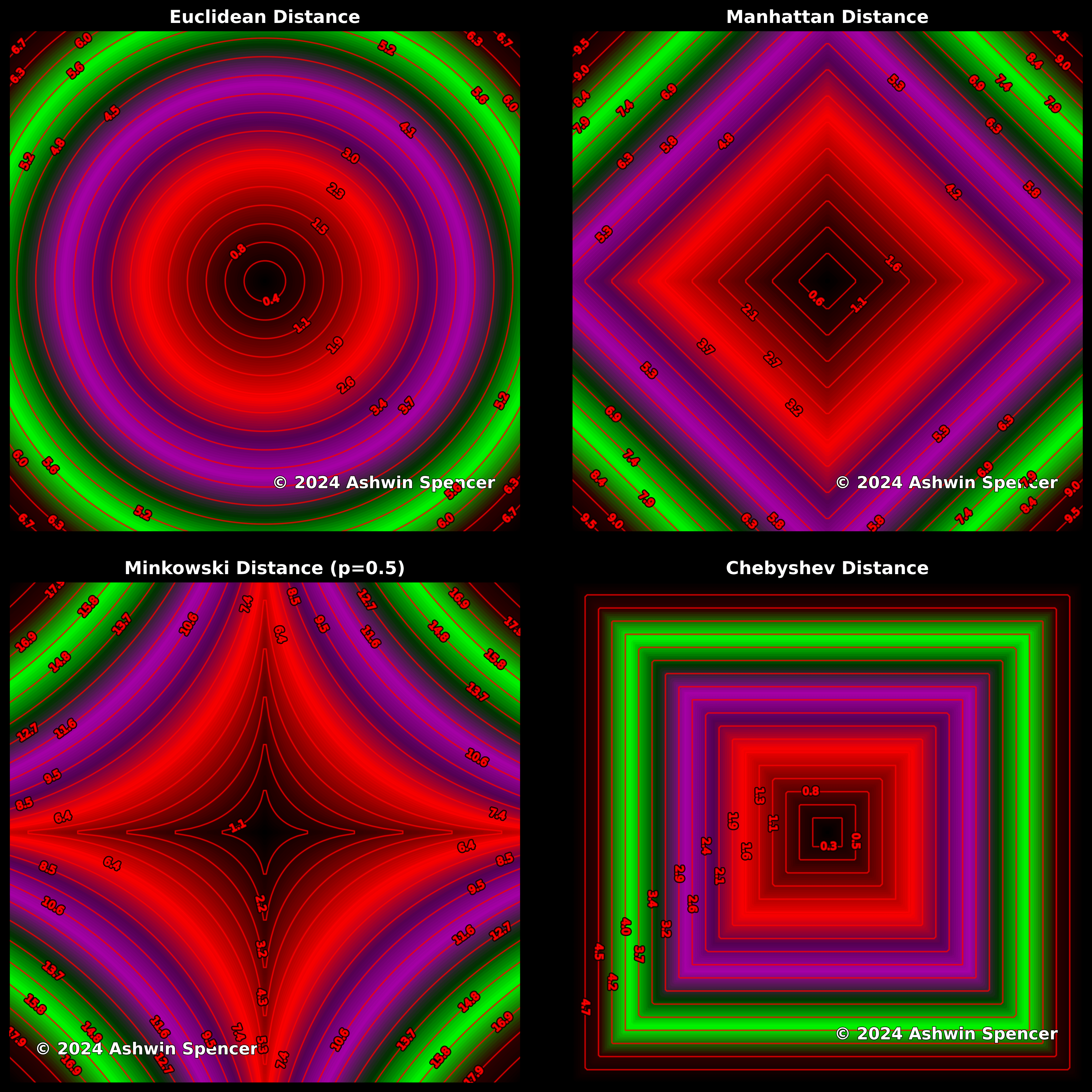[OC] Visualizing Distance Metrics. Data Source: Math Equations. Tools: Python. Distance metrics reveal hidden patterns: Euclidean forms circles, Manhattan makes diamonds, Chebyshev builds squares, and Minkowski blends them. Each impacts clustering, optimization, and nearest neighbor searches.