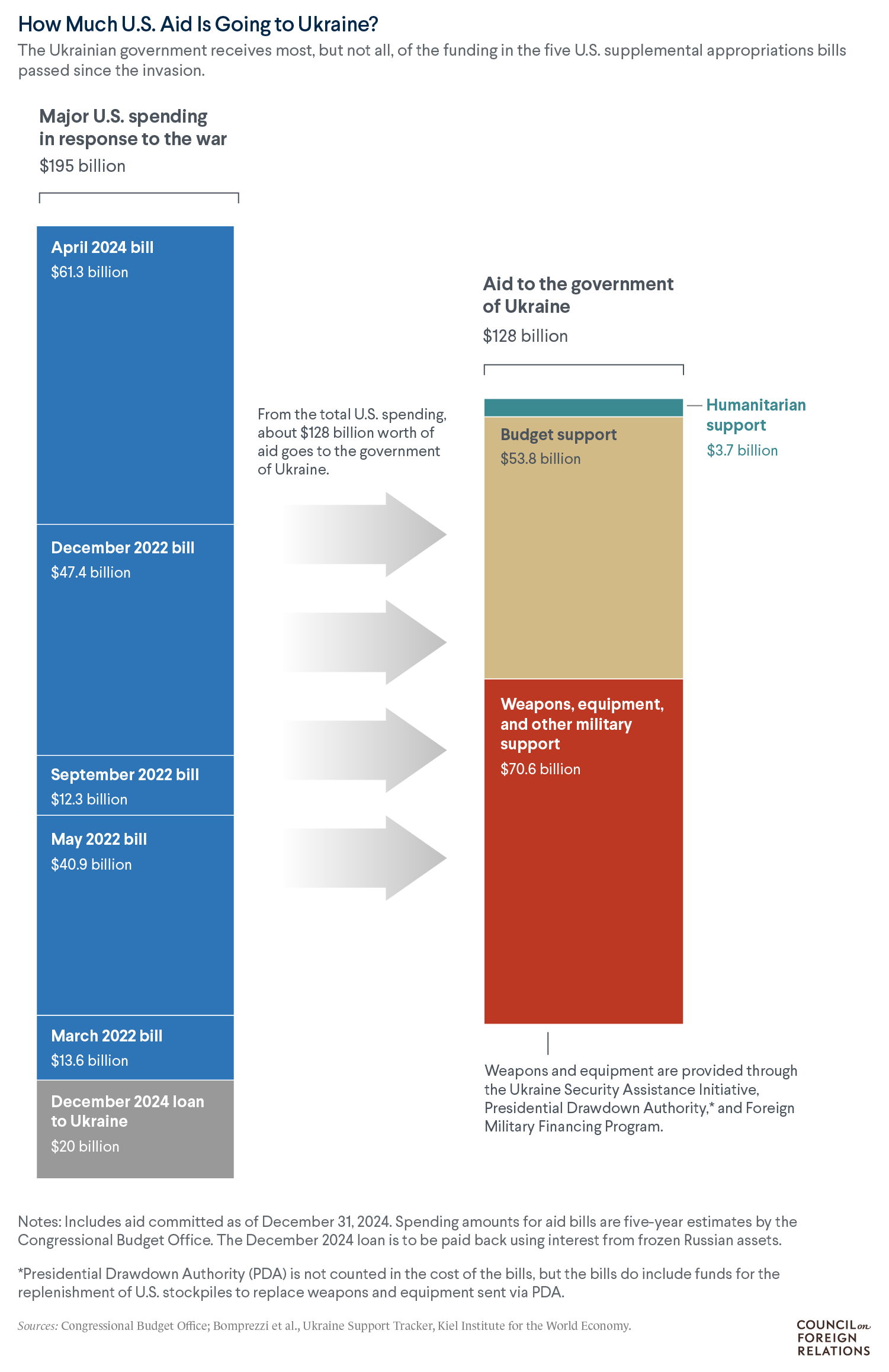 It’s important to note that of the total U.S. government spending related to the war, about $128 billion directly aids the government of Ukraine, according to the Kiel Institute for the World Economy. Most of the remainder has funded various U.S. activities associated with the war in Ukraine, and a small portion has supported other affected countries in the region. [See more charts](https://www.cfr.org/article/how-much-us-aid-going-ukraine?utm_medium=social_owned&utm_source=reddit) on aid to Ukraine.