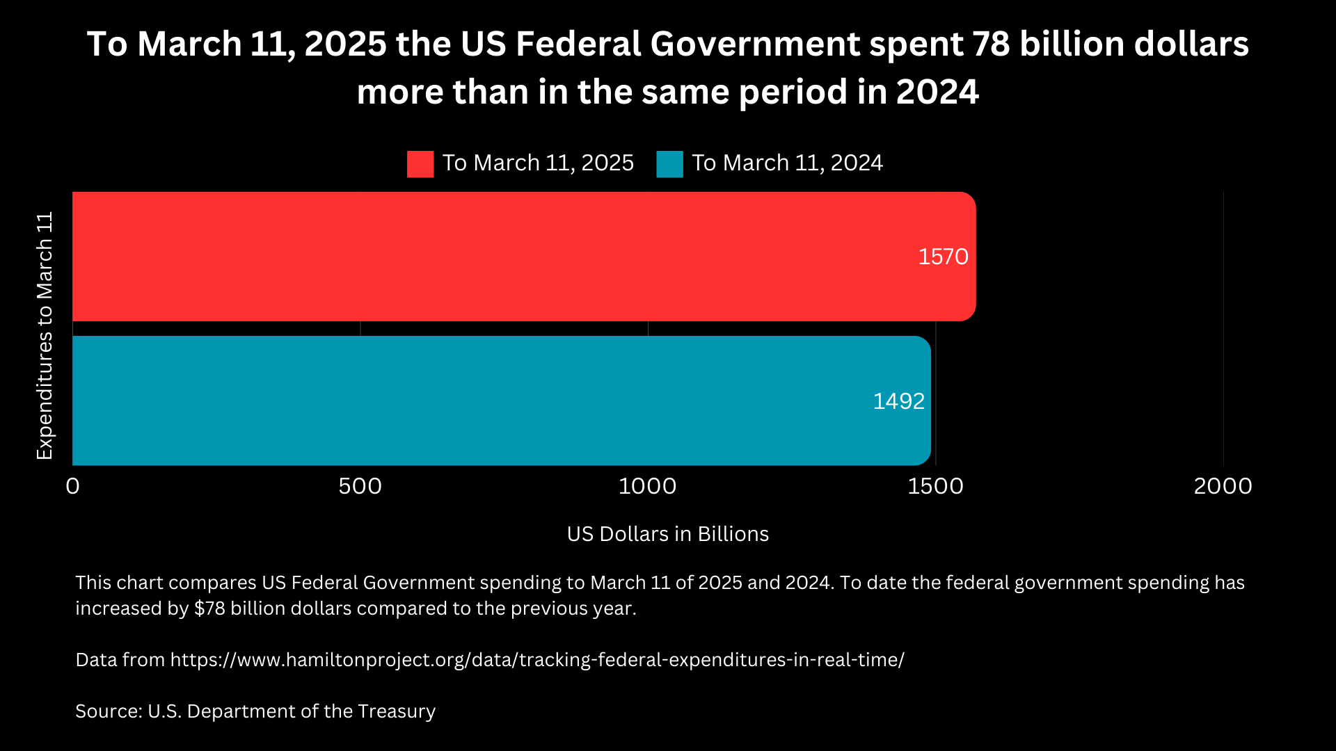 [OC] To March 11, 2025 the US Federal Government spent 78 billion dollars more than in the same period in 2024