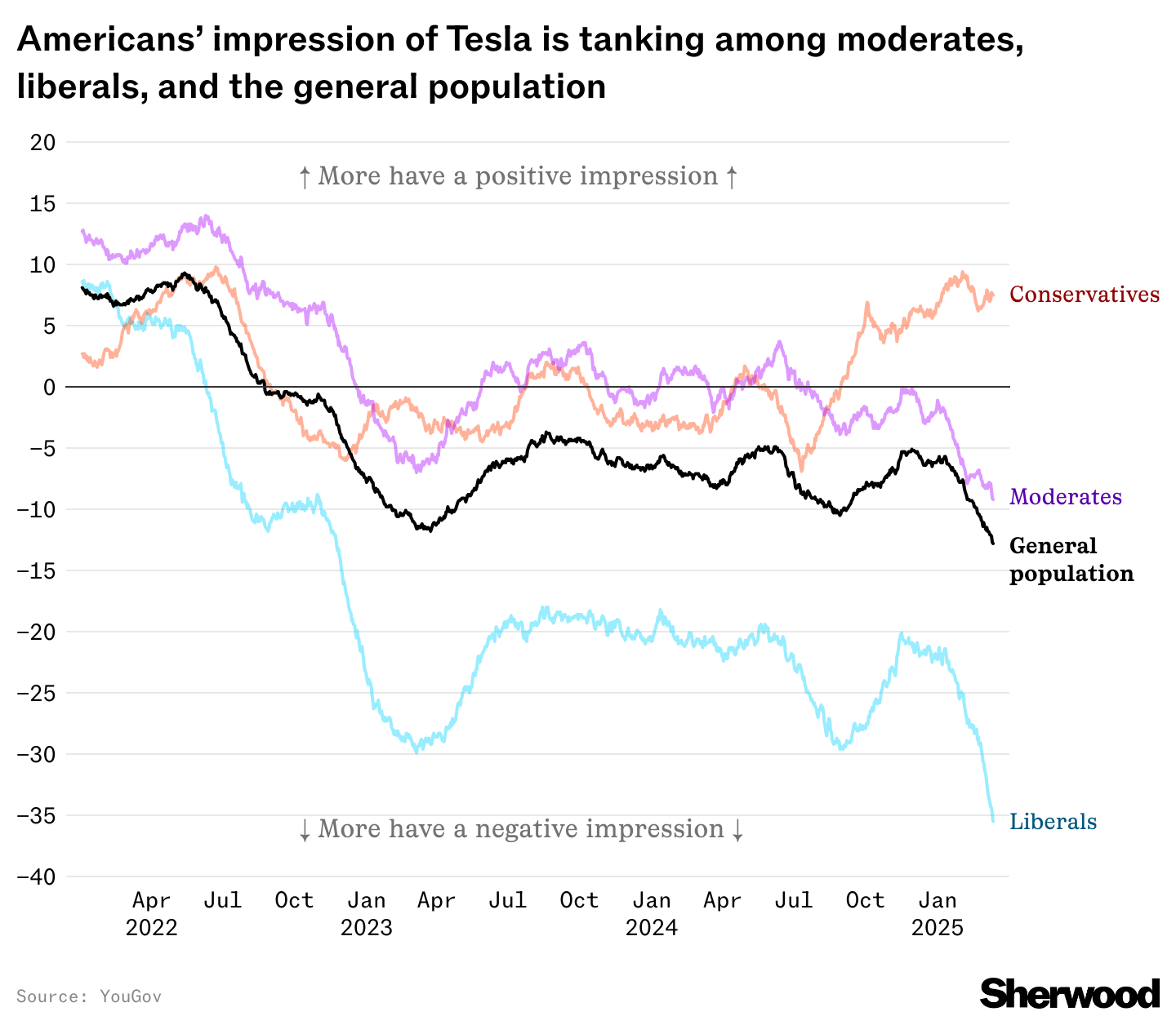 Maybe overall this is a good thing. Liberals are already more sold on the idea of an electric car. Conservatives will start buying more of them out of fealty to President Musk. Tesla goes bankrupt (hopefully) but by then the electric car (of any brand) is more popular on both sides of the political spectrum.