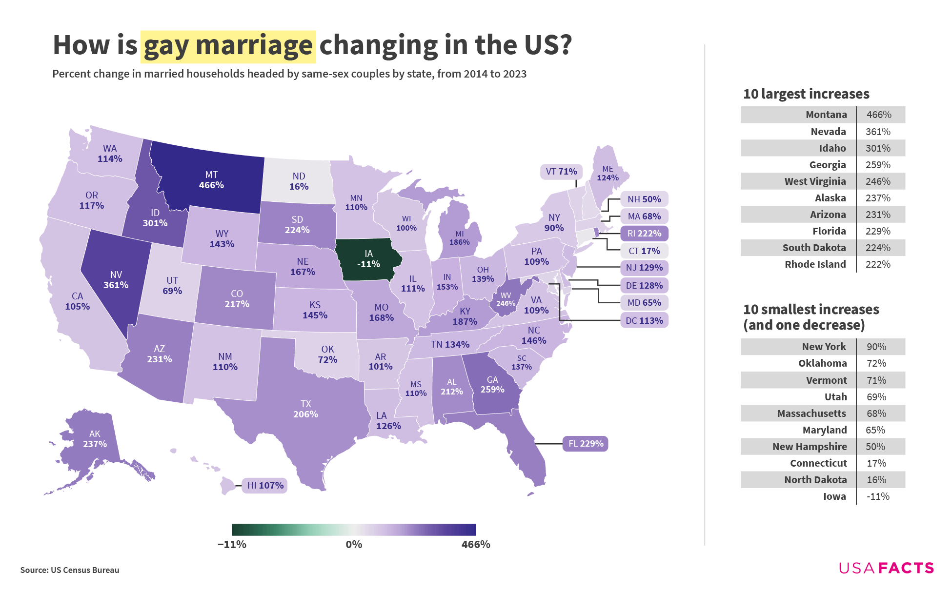 Since 2014, Montana had the largest increase in married same-sex households, 466.5%. Montana started with one of the lowest counts, however — 540 married households in 2014 — which grew to 3,059 by 2023. Nevada followed at 361.5%, and Georgia was third at 258.9%.