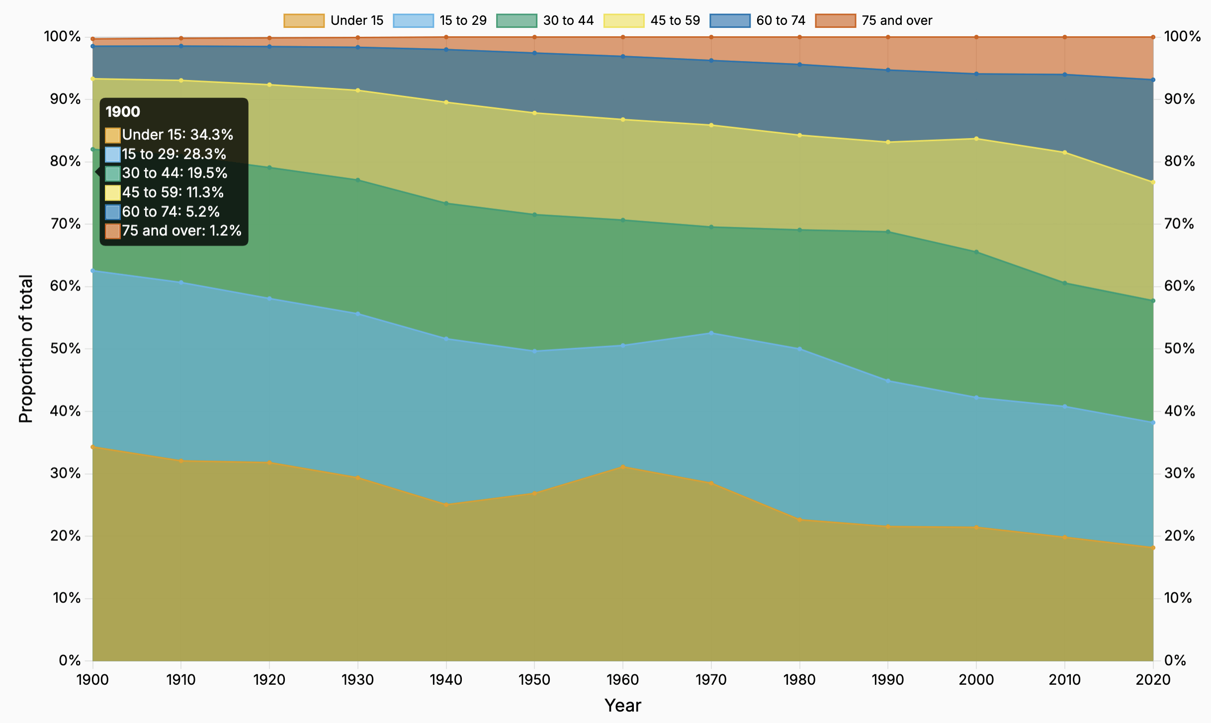 Use the controls to change the number of age groups, or toggle between ratios, growth rates, and totals.