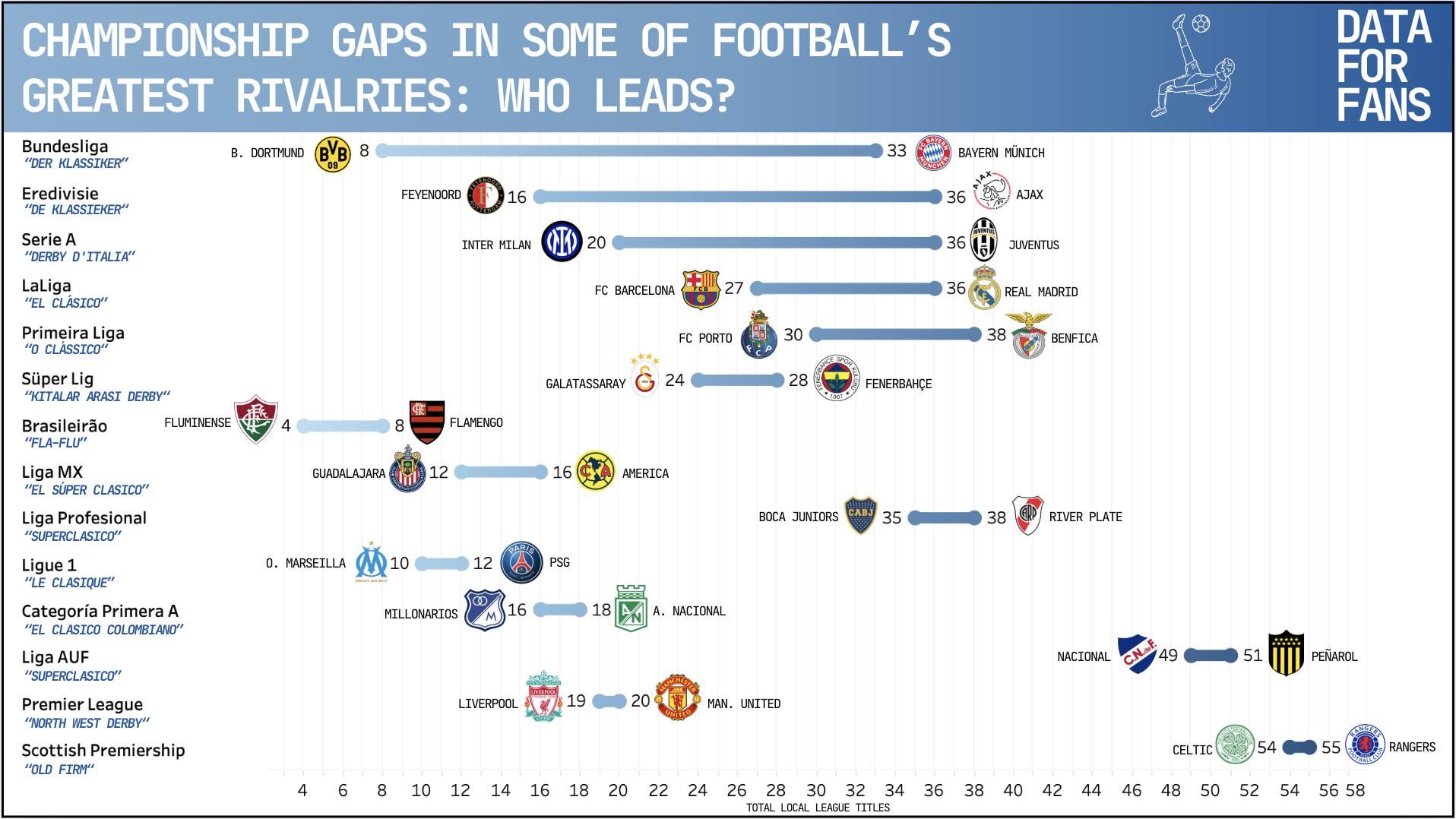 Since some leagues have existed longer than others, I feel like the x-axis is unfair. Showing the total number of championships awarded in each league might be a good workaround to counter this. This will also allow us to understand how much the two rival clubs contribute relative to the entire league’s history.