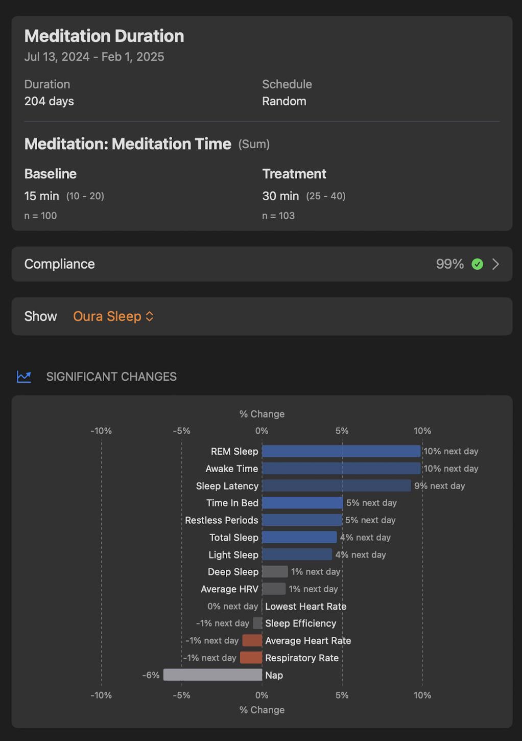 **Source:** I analyzed sleep data automatically provided by my [Oura Ring](https://ouraring.com/). The visualization was created with [Reflect](https://apps.apple.com/us/app/reflect-track-anything/id6463800032), a personal tracking iOS app I’m a co-creator of. I developed the self-experiment feature in the app and associated result visualizations)