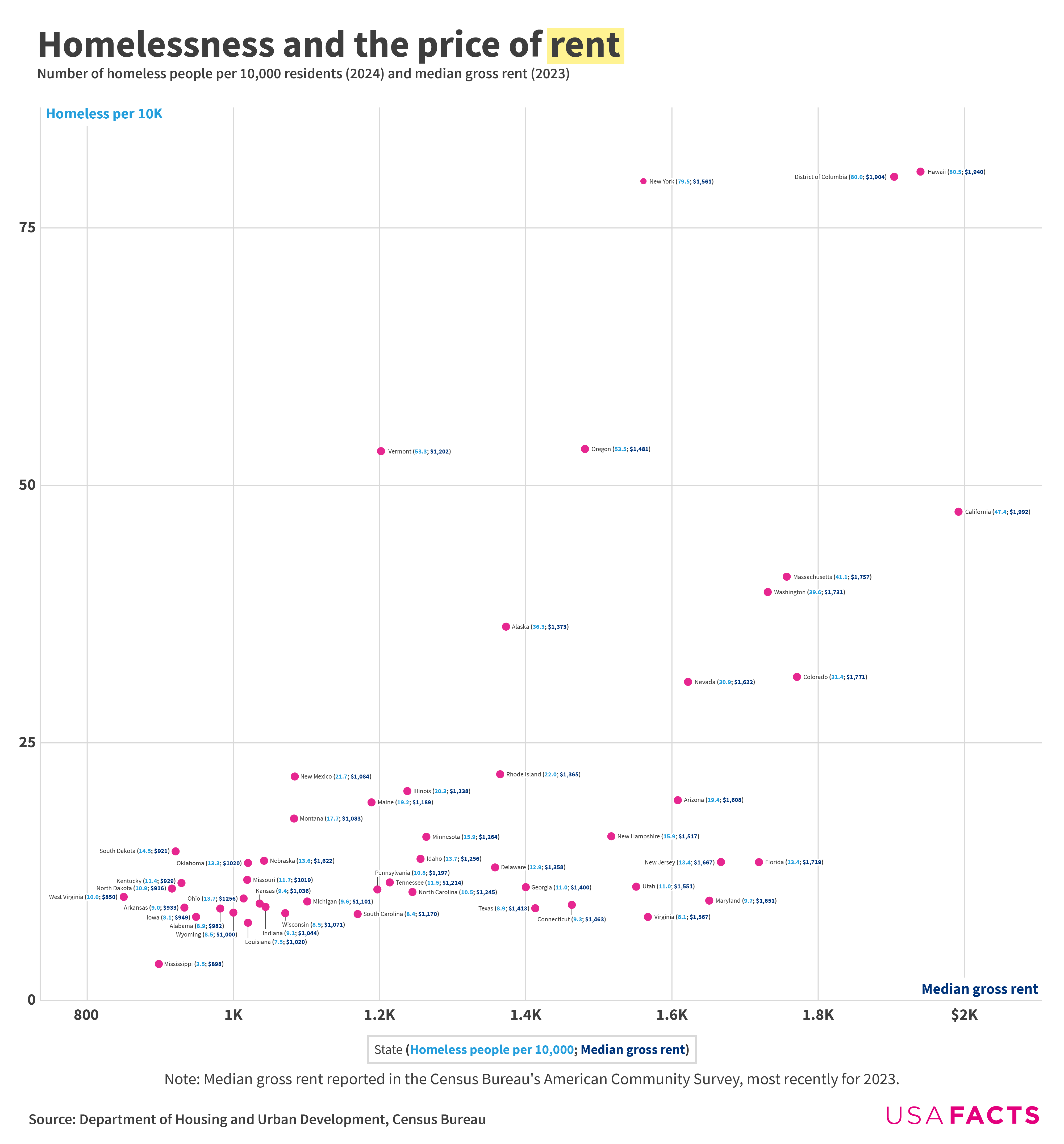 >According to a 2020 [Government Accountability Office report](https://www.gao.gov/assets/gao-20-433.pdf), rent prices can play a role in homelessness rates. California, Washington, DC, and Hawaii had the nation’s highest rents in 2023 and were all among the six states with the highest rates of homelessness in 2024. Mississippi had both the country’s second-lowest rents and the lowest homelessness rate.