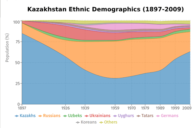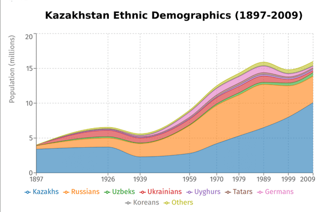 Wild how the demographics flipped over time! Russians peaked around the late Soviet era, but then Kazakhs surged after independence. Also, shoutout to the Germans. Came out of nowhere mid-century and then almost vanished.