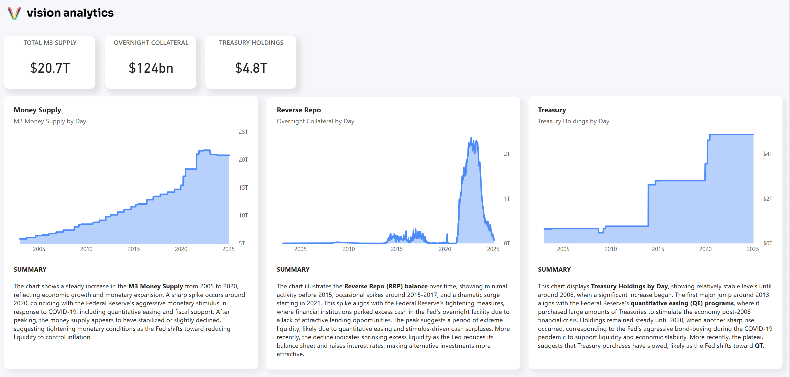 The Federal Reserve's liquidity policies have significantly shaped markets over the years. This visualization highlights three key trends: M3 Money Supply saw steady growth post-2008, spiked in 2020 with stimulus, and is now stabilizing. Reverse Repo balances surged to record highs in 2021 as excess liquidity flooded the system but are now rapidly declining. Treasury Holdings expanded through QE programs and have plateaued as the Fed shifts toward QT. With liquidity tightening, what comes next for markets?