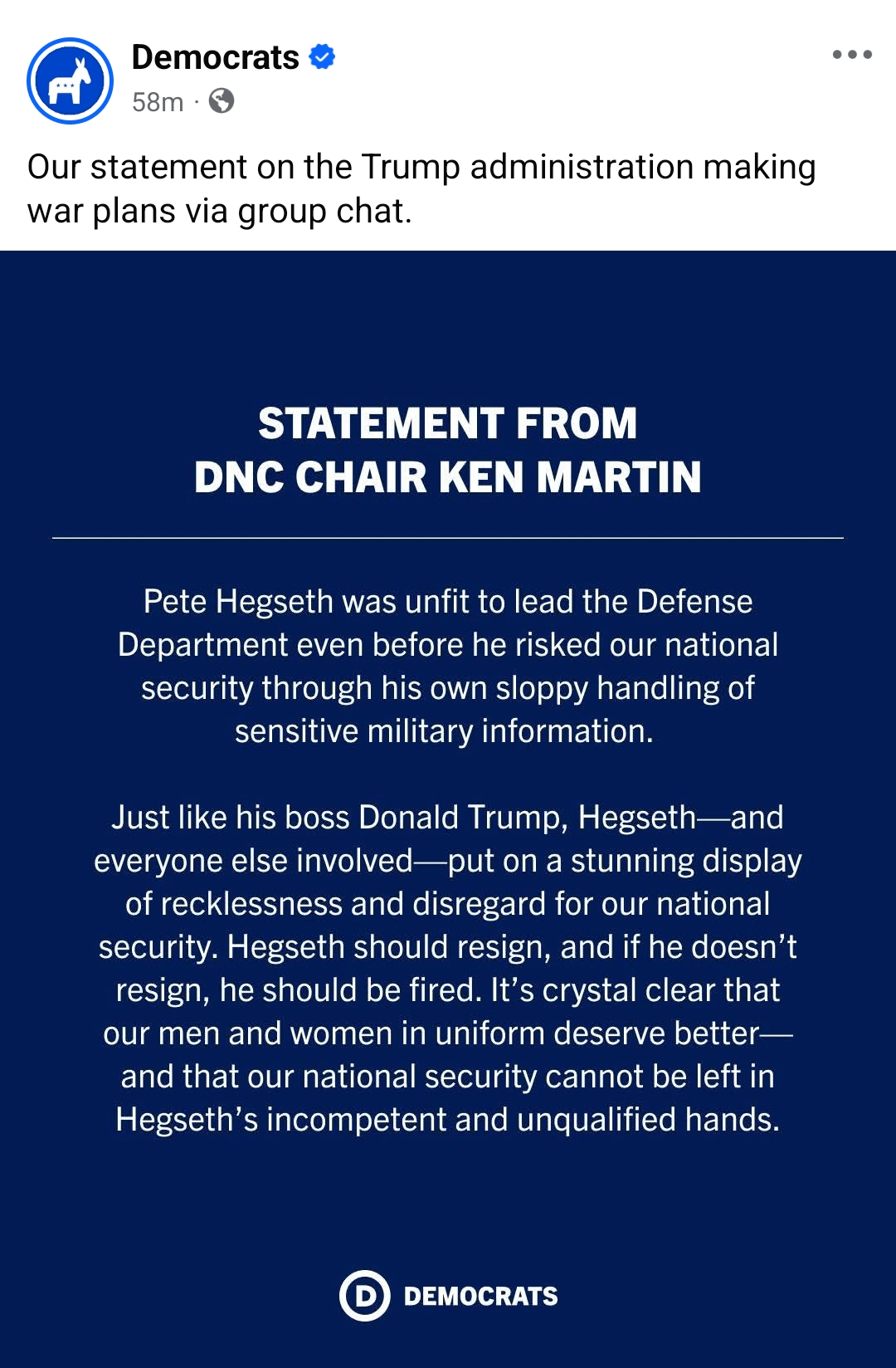Democrats’ statement on the Trump administration making war plans via group chat
