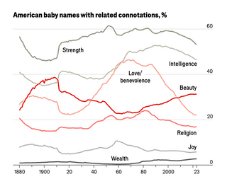 The analysis, published in this week’s issue of *The Economist* also features a new “informant”. Historically, studying what a name evokes has been hard to quantify, but artificial intelligence offers a method of doing so. “What word follows…” is the problem large language models (LLMs) were made to solve. These models, trained on enormous corpora of text, can reveal clusters of associations. So I enlisted an LLM to provide the top five connotations of all popular names. My prompts—more than 30,000 of them—produced 7,439 unique descriptors, including “purity”, “warrior” and “socially awkward”. (Ironically the most popular description was “unique”, tied to 12,124 different names; for those worried about energy use–I used small input/output structures and an efficient model.)
