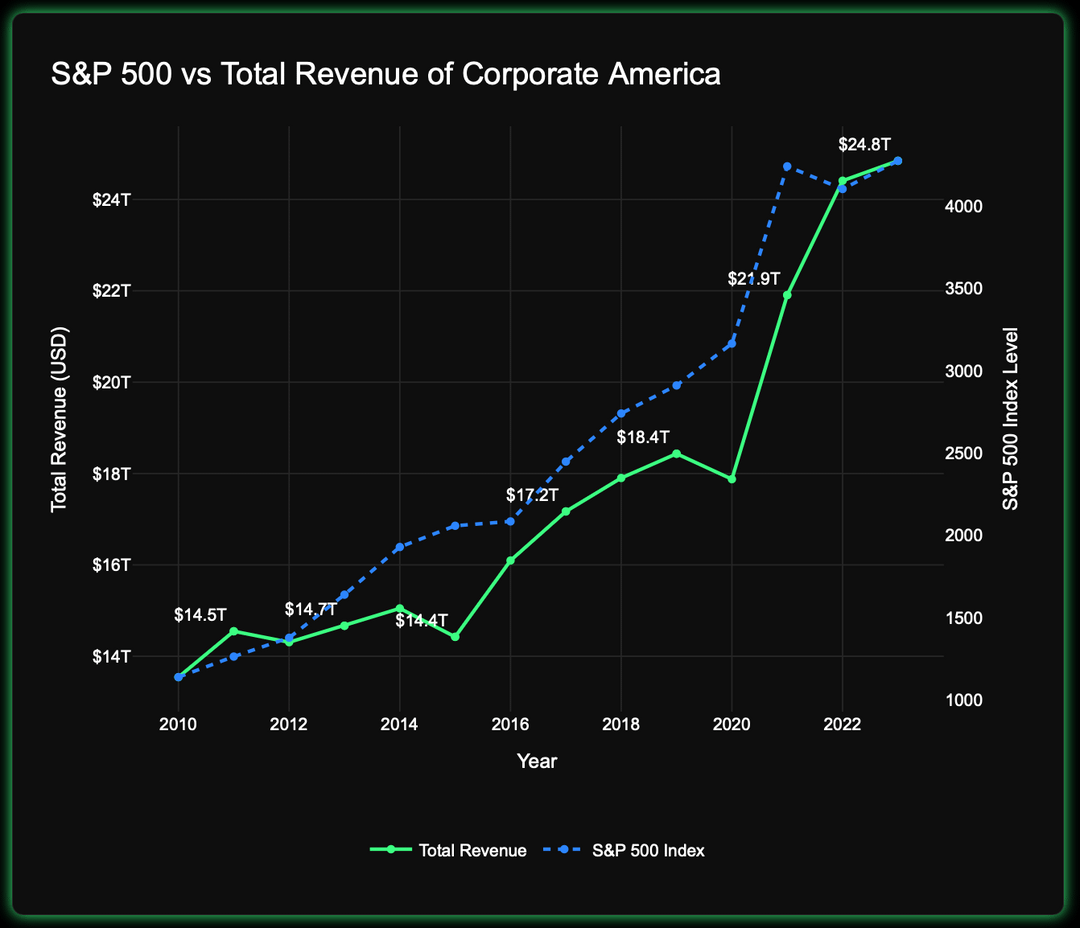 This visualization shows the cumulative growth of the S&P 500 index versus the total revenue of publicly reporting U.S. corporations (via EDGAR). While the S&P 500 rose ~275% since 2010, corporate revenue grew only ~83%.