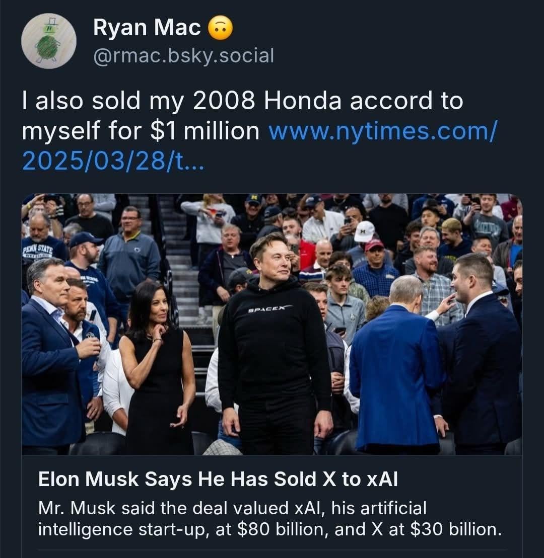 He bought Twitter for $44B and sold it to himself as X for $30B. 🤣🤣🤣🤣🤣🤣