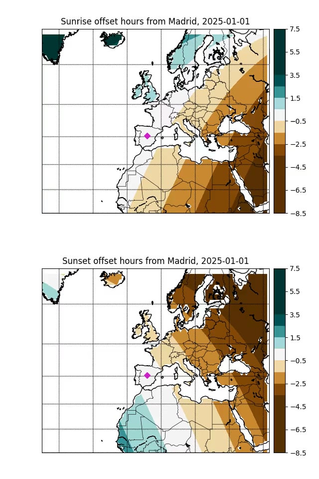 A colación del último post sobre el "desajuste" horario de España, viendo las nociones incorrectas de cómo ocurre el amanecer y atardecer en función de la latitud y la longitud, quise encontrar una ilustración como esta y no la encontré, así que la he generado yo mismo. Hay algún artefacto en los perímetros de los países, pero cumple su función.