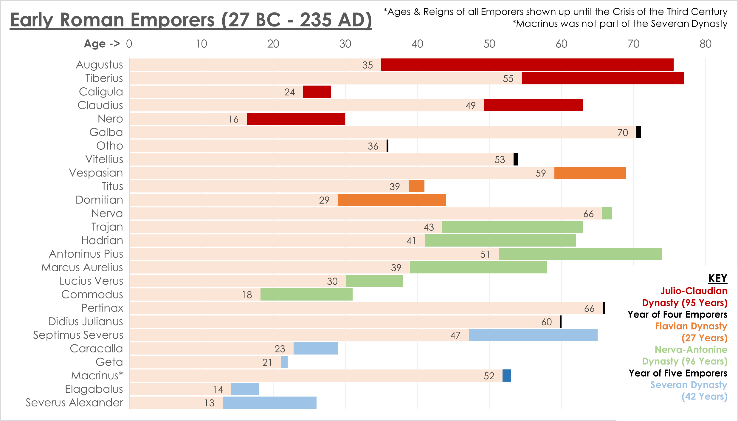 Graphic by me, created in excel. Source: https://en.m.wikipedia.org/wiki/List_of_Roman_emperors