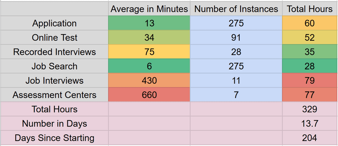 Rather than adding up the hours in the last table to days you should do work days. And then exclude weekends from days looking. Really make it apparent how looking for a job is a full time job