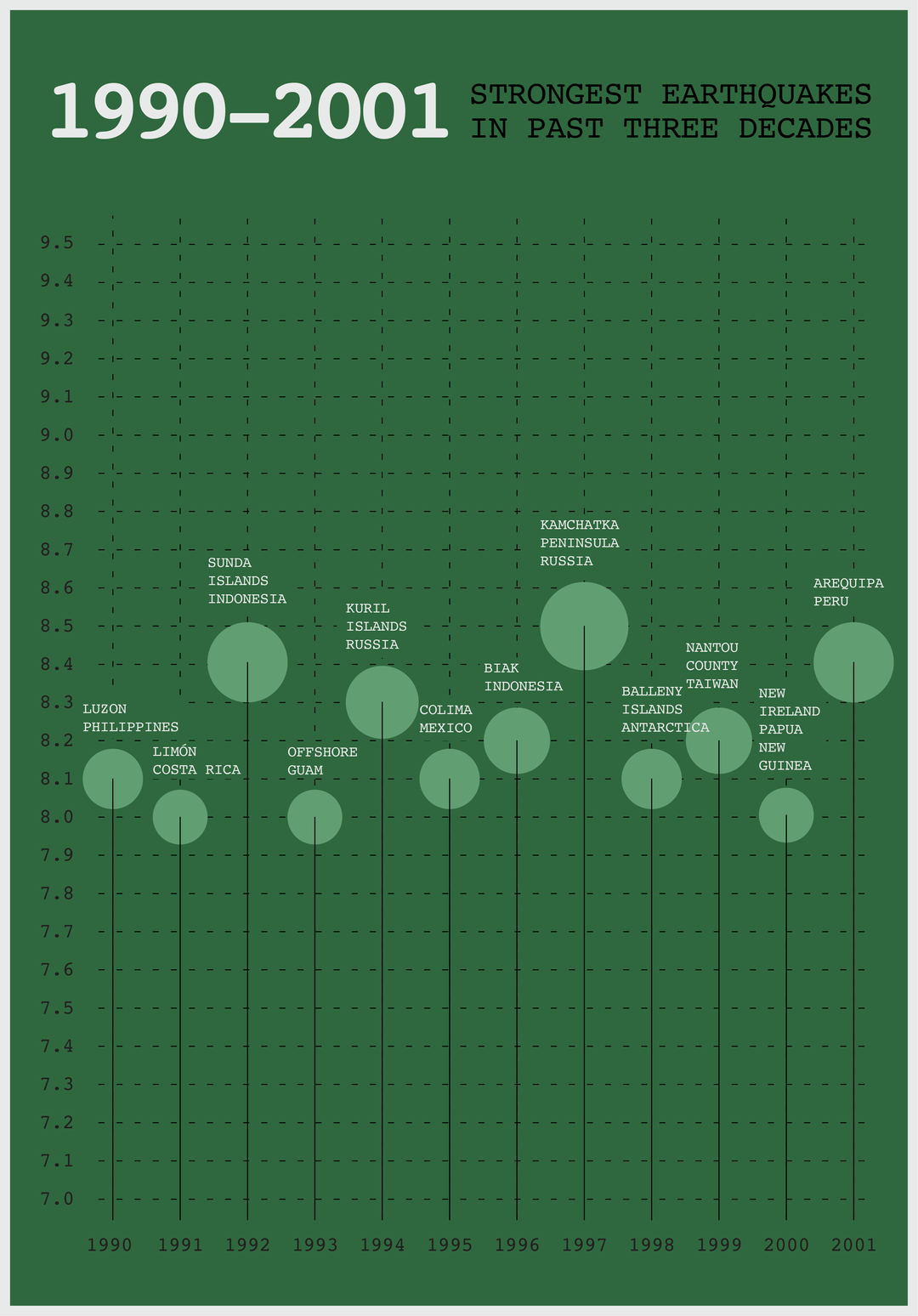 I made this data-visualization exploring the strongest earthquakes in the last 35 years.
