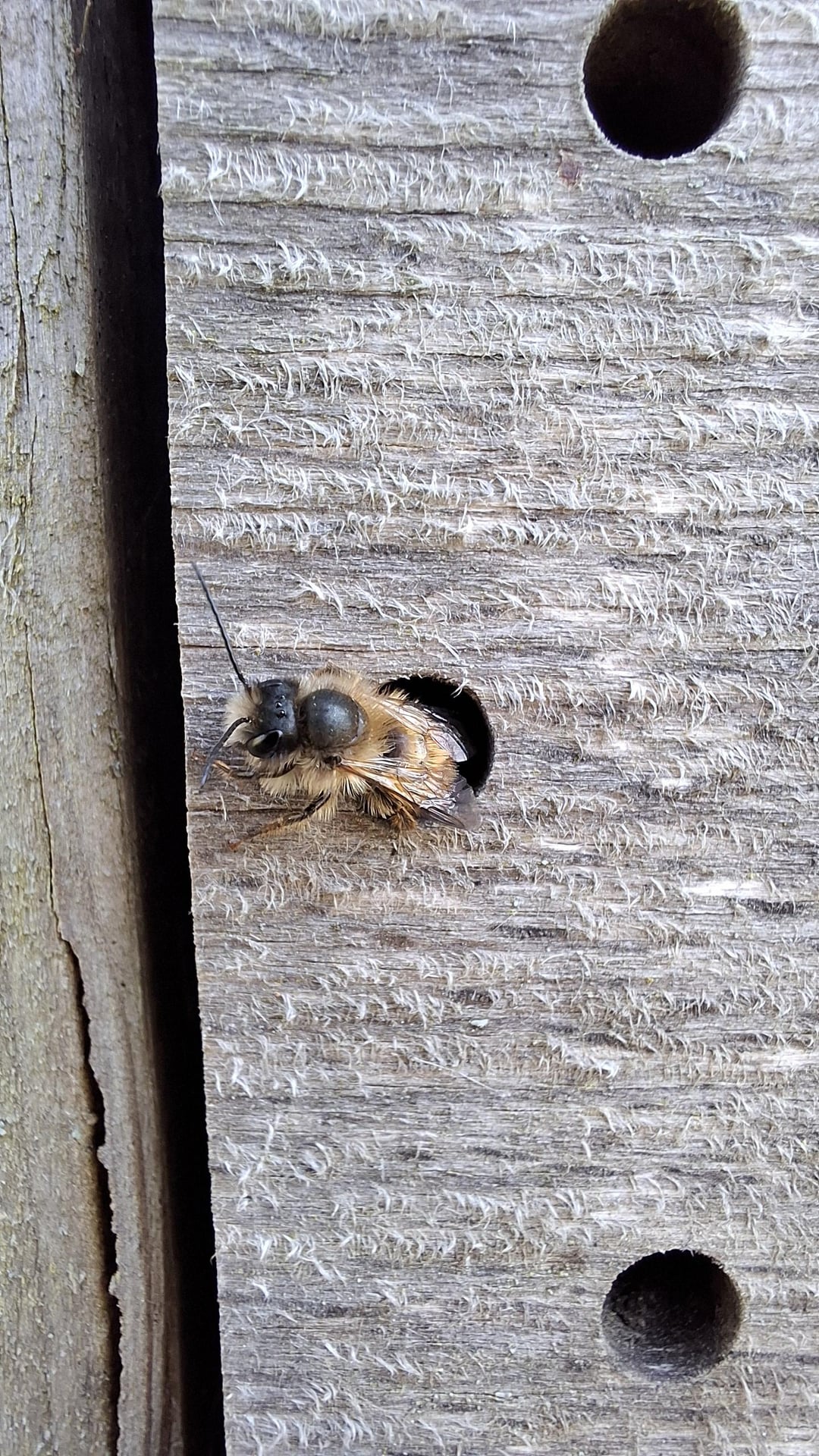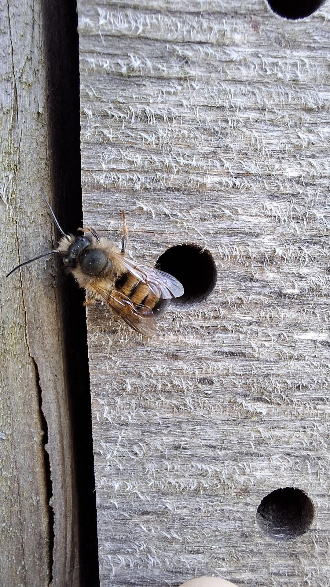 Unsere diesjährig erste Bewohnerin des frisch renovierten Insektenhotels ist gerade dabei einzuziehen. Noch etwas langsam, unterkühlt und mit Tau auf der Stirn, bewegt sie sich Richtung der ersten Sonnenstrahlen.