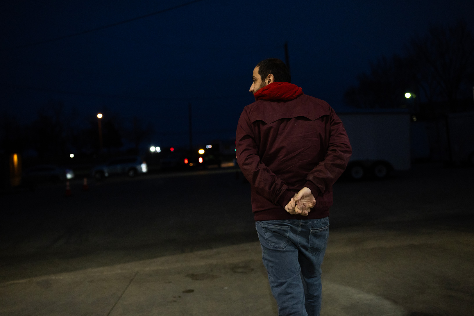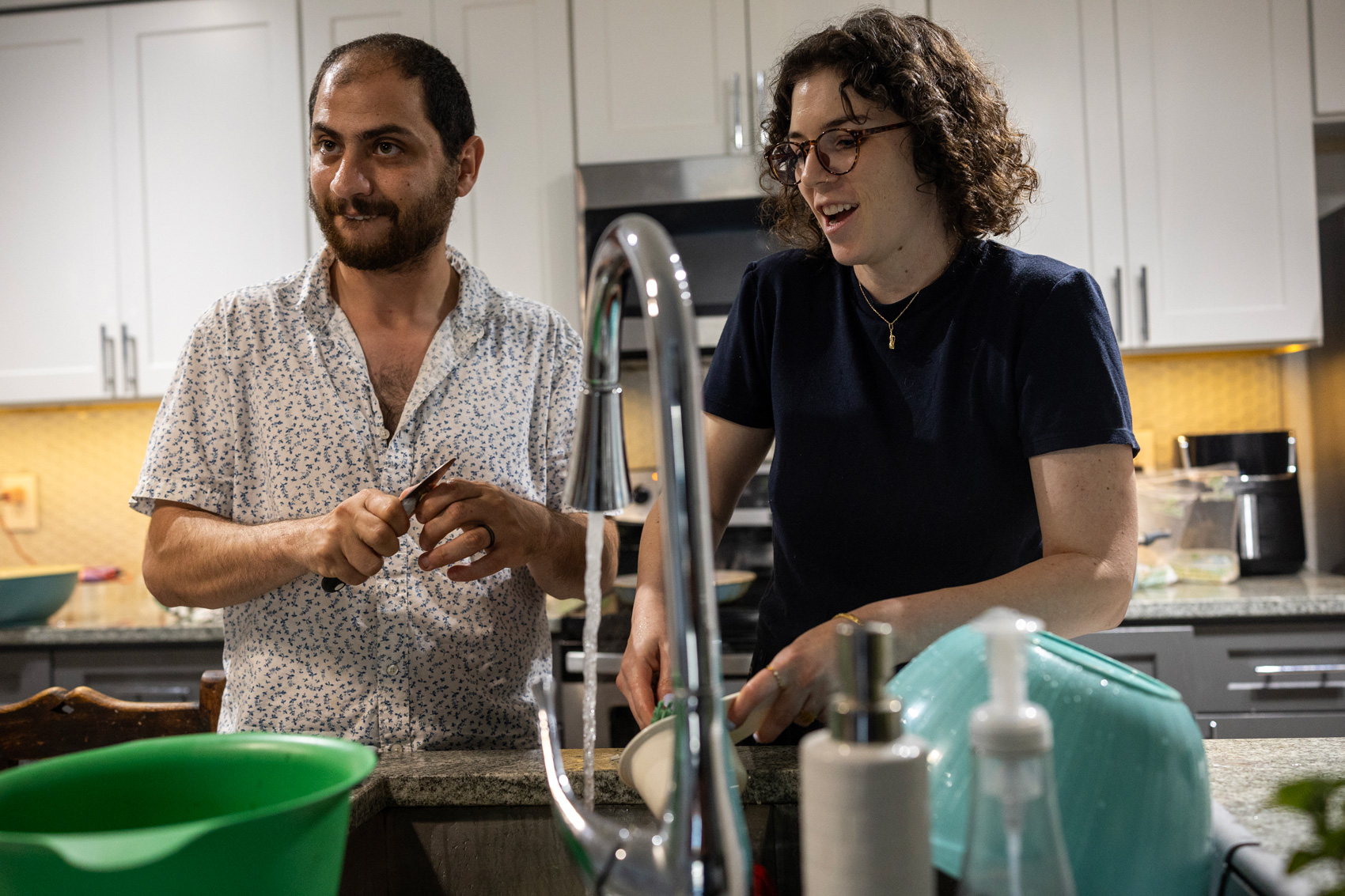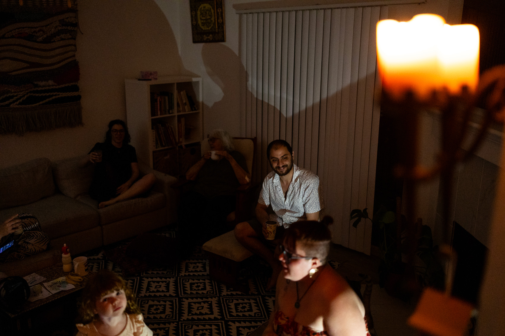 As Mahmoud Khsyaem was finishing making tea to wash down their meal, a storm rolled through and cut the power in their apartment building for hours. “Now we’re a real Syrian family,” Koseyaem said, referring to the regular blackouts in his home country of Syria. Later in the night, Koseyaem got a FaceTime call from his father Abdulkadr Mahmoud Kysyaem who lives in Aleppo with the rest of Mahmoud’s family. The pair spoke for nearly an hour and ended with his father wishing him Eid Mubarak. (Antranik Tavitian / Houston Landing)