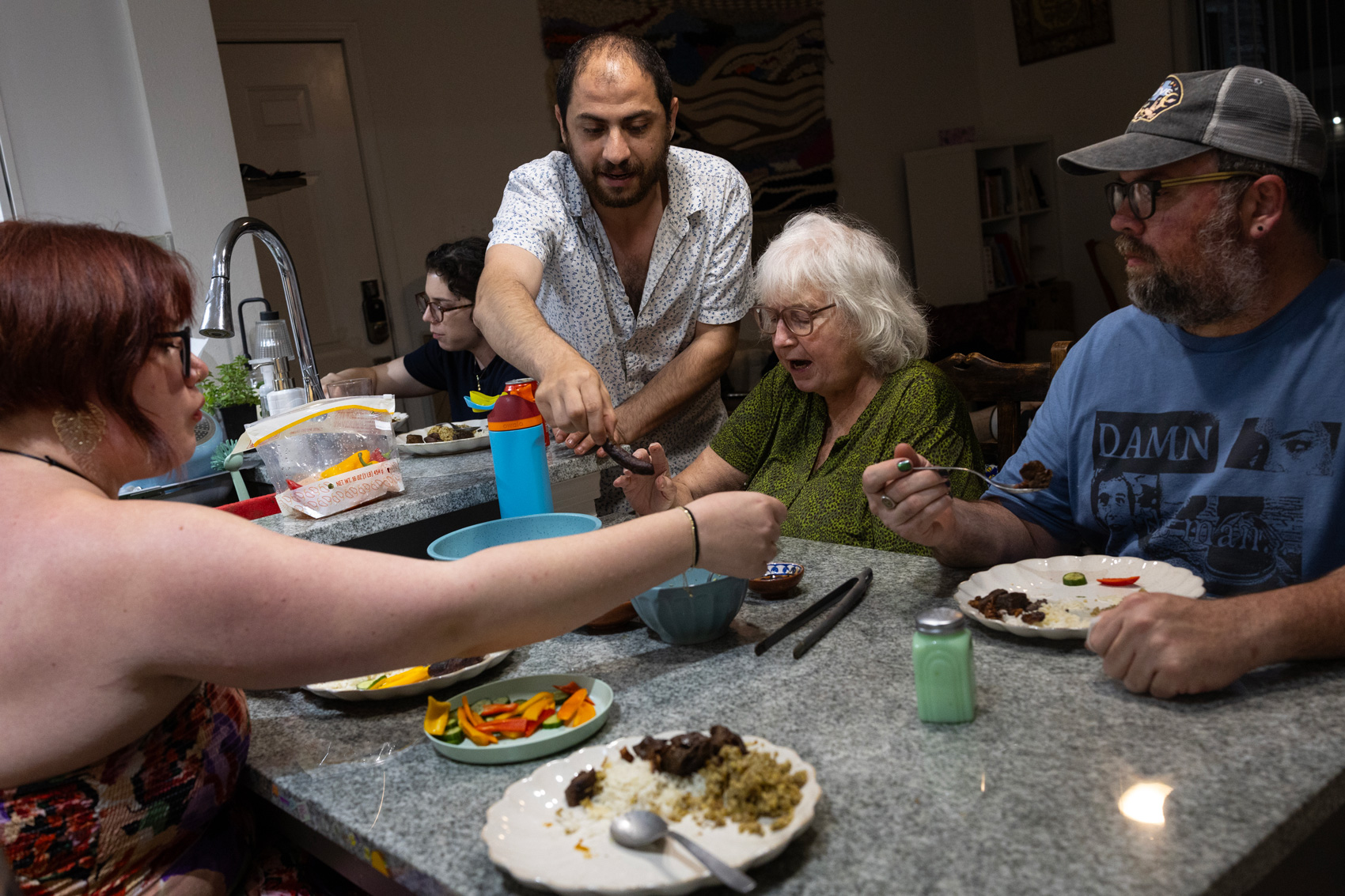 Ramadan, the Muslim Holy month, is a special time for Mahmoud Koseyaem. It’s been nearly 14 years since he was in Syria. He often speaks about missing the street food and his family. Koseyaem and his in-laws decided to celebrate Eid on the 8th day of Ramadan with a night time dinner to break fast. They ate freekeh, rice, beef sausage dipped in pomegranate molasses, steak seared with spices and dates- all the foods from his hometown of Aleppo. (Antranik Tavitian / Houston Landing)