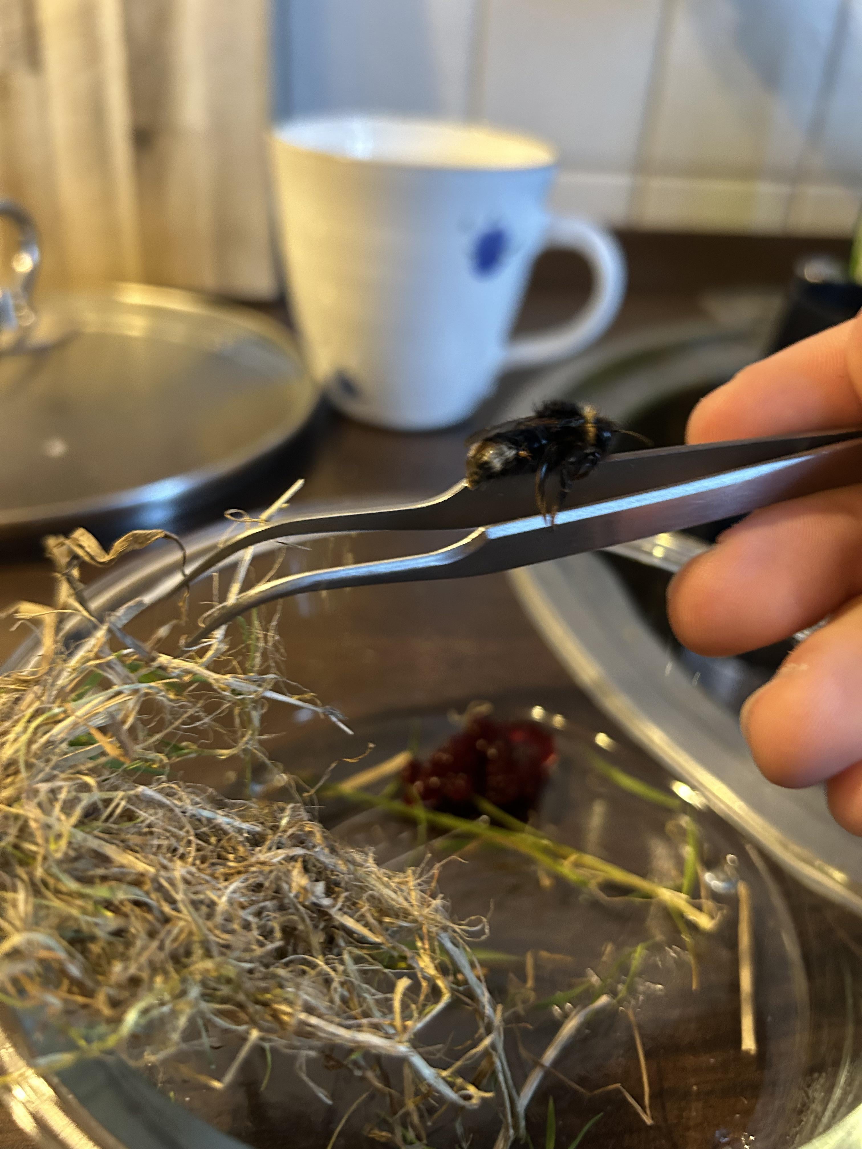 Ich habe die Biene nach Hause getragen und dachte unterwegs sie sei geworben. Zu Hause kletterte sie dann aber munter rum. Marmelade fand sie gut, ebenso das Apfelmus. Ich habe ihr mit einer OP-Pinzette die Milben manuell vom Körper gelesen. Vor allem unter den Flügeln saßen insgesamt locker 40-50 Stück, auch am Hals. Sie war sehr kooperativ und nach jeder Milbe fixer unterwegs. Es hat jetzt echt lange gedauert, aber ich konnte keine mehr finden. Nach etwas weiteren Marmeladenflüssigkeit habe ich sie in unsere Balkonblumen gesetzt. Fünf Minuten später war sie weg.