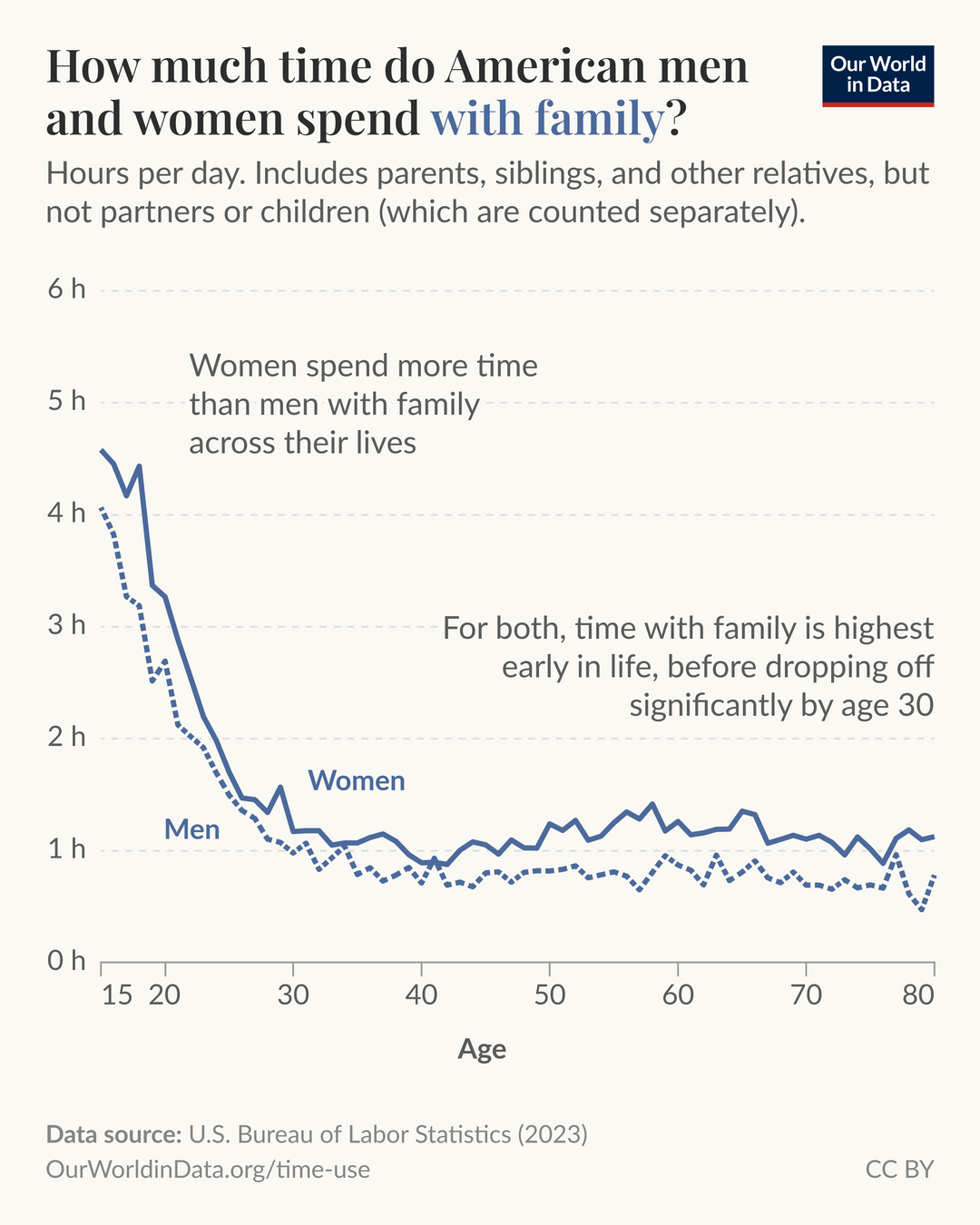 8. This graph appears from time to time in the “male loneliness epidêmic” discussion. But we can see women and Men spend more or less the same time with family and friends, the gap comes from work and kids