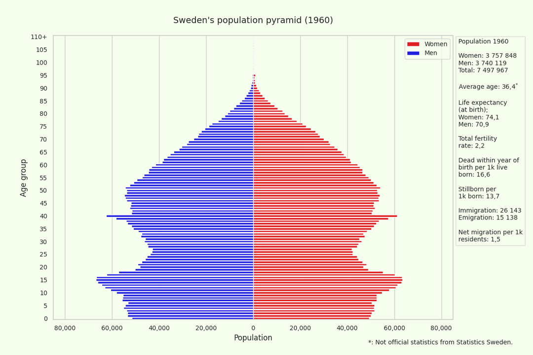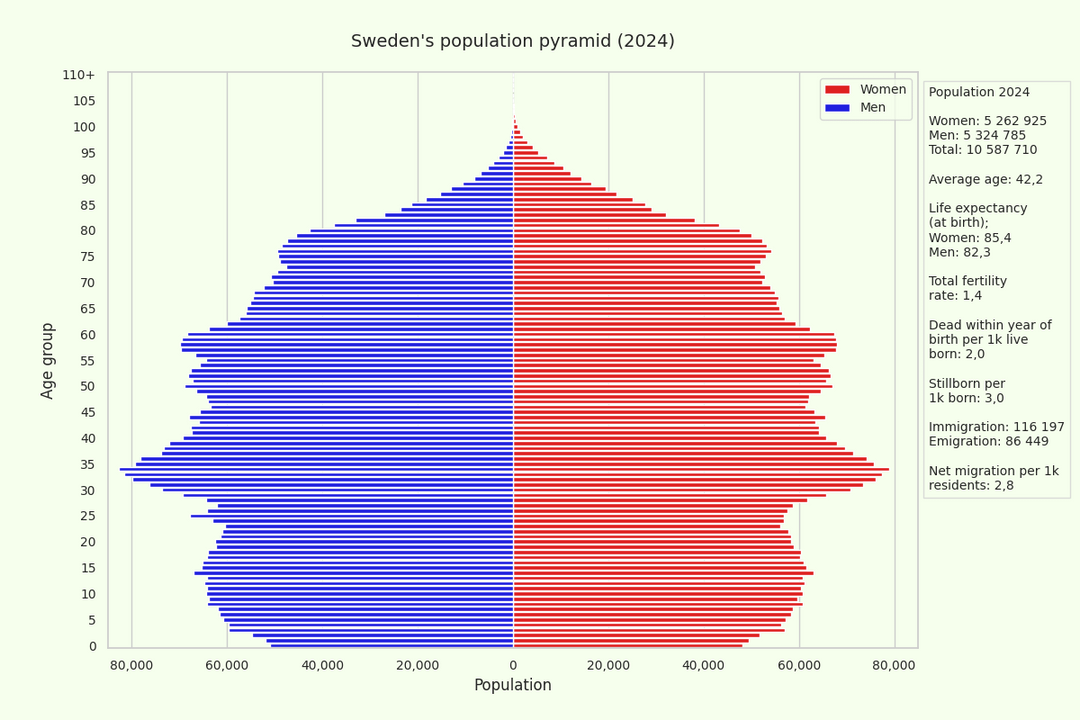 GIF showing the changing population pyramid of Sweden from 1860 to 2024. Some extra stats is included.
