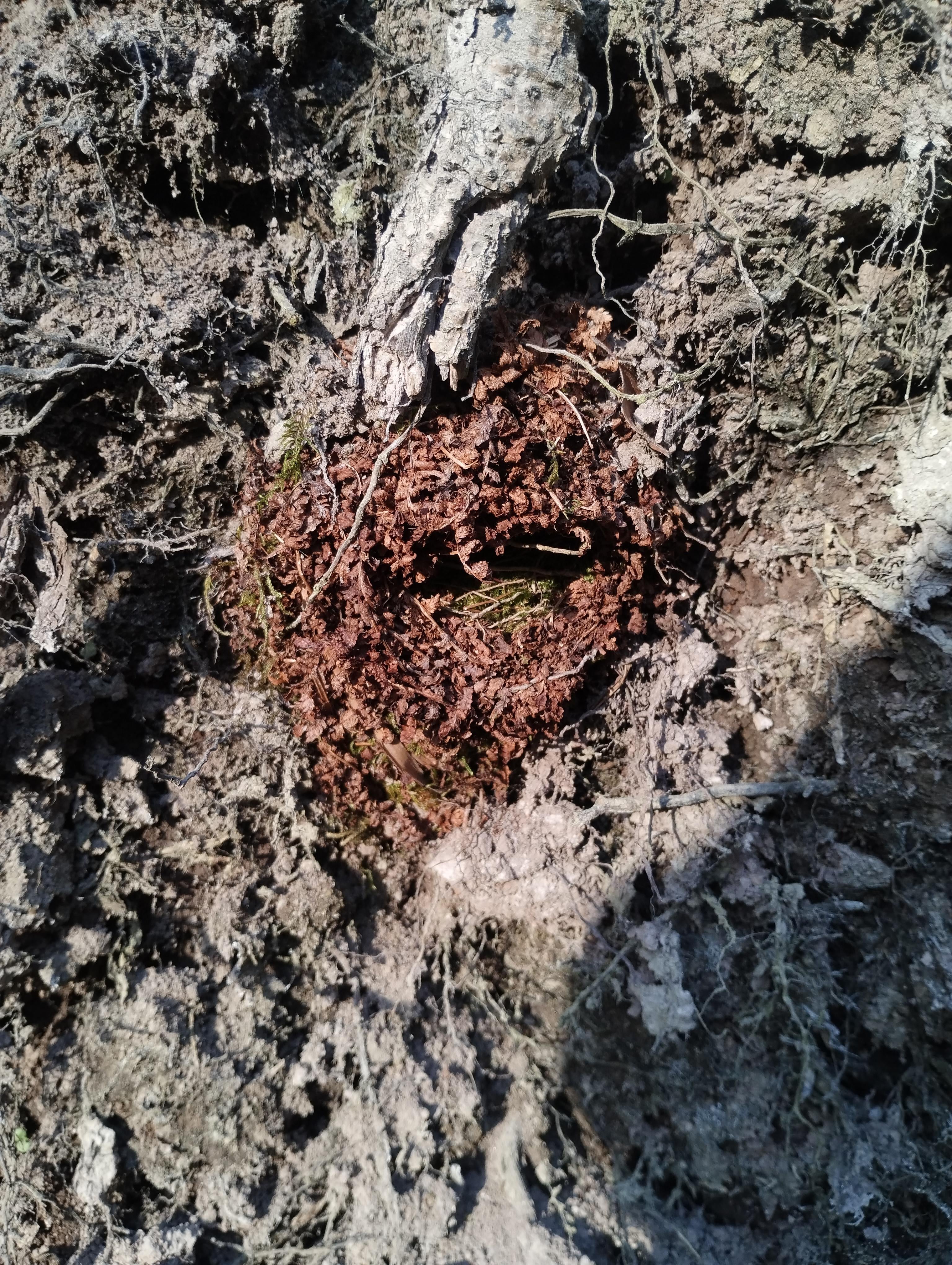Hing am Rand von einem Wurzelteller, also unter der Wurzel von einem umgekippten Baum. Anscheinend ist vor dem Nest eine Barriere aus Farnwedeln gebaut worden.
