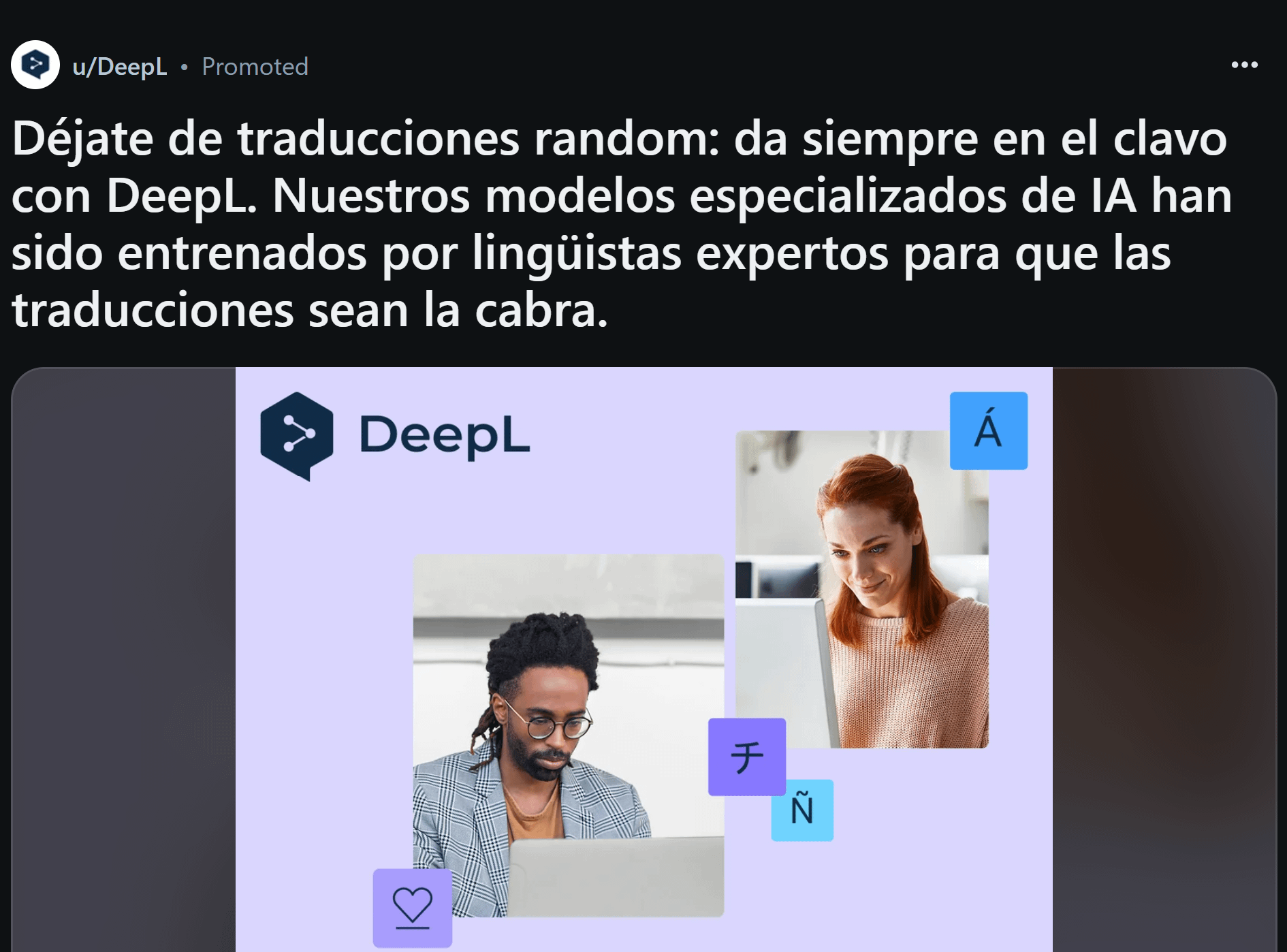 El lingüista experto no sé si en Español o Inglés debe haberse sacado el título enla Universidad Bovina. by mitsu85 Tags:spain 5 comments La ironia del GOAT = Cabra, siendo un anuncio sobre traducciones es simplemente sublime. A no ser que sea aposta, pero la verdad…lo dudo mucho. La gente lleva un par de años diciendo “cabra” en vez de GOAT en ese sentido. ¿Cringe? Puede. Pero creo que lo han hecho a posta. Definitivamente a proposito https://preview.redd.it/hiyfd4crehue1.png?width=1335&format=png&auto=webp&s=1cbdc161ee4b78deb6f13a578a5c477e3359389b DeepL es uno de los mejores que uso. Lo prefiero ante de que el traductor de google. Es muy común decir lo de ser la cabra, es un pogo tongue in cheek, y aquí creo que lo hace aposta xd Comments are closed.