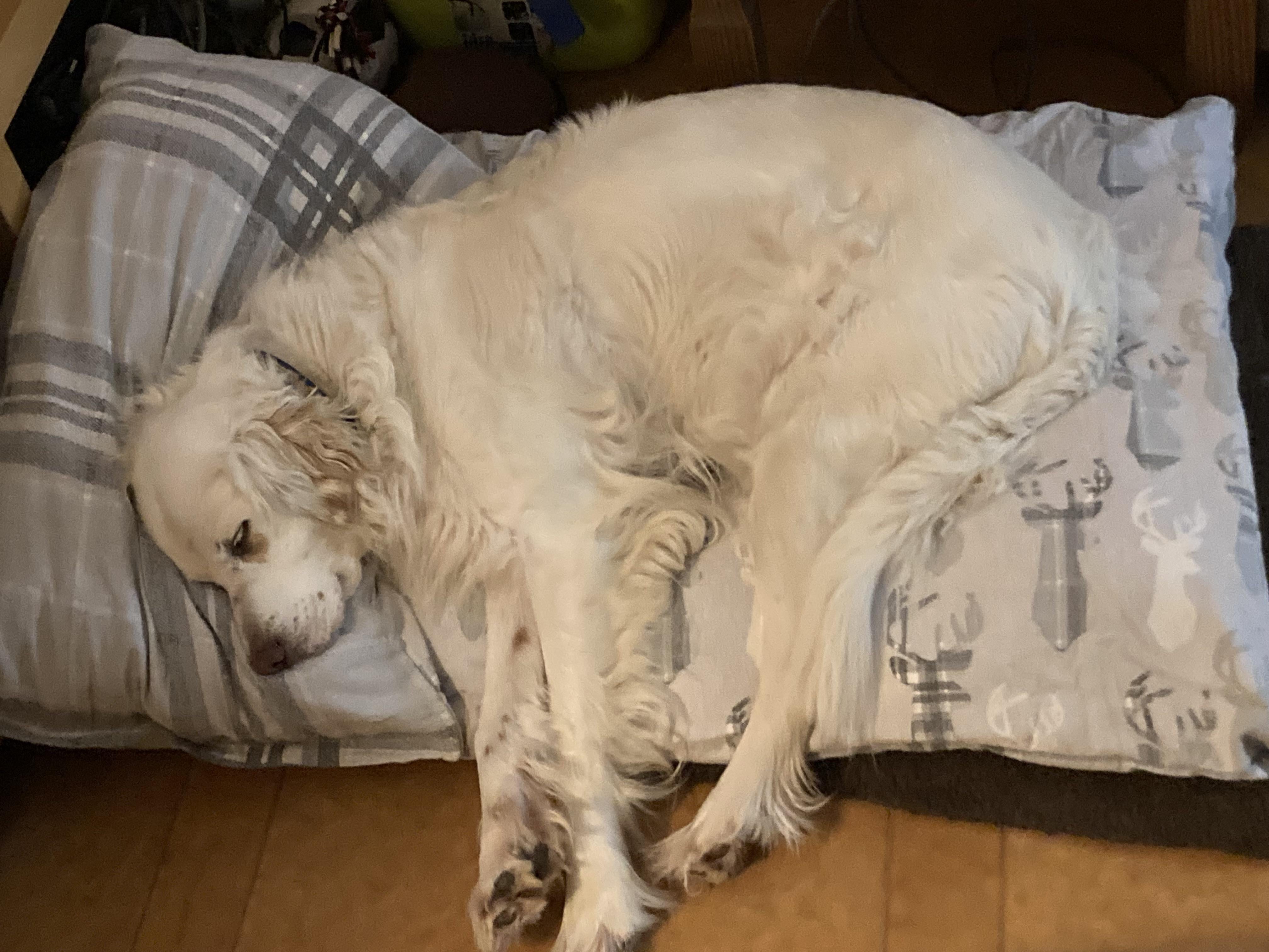 He looks like The Last Unicorn. Glad he’s enjoying his new bed!