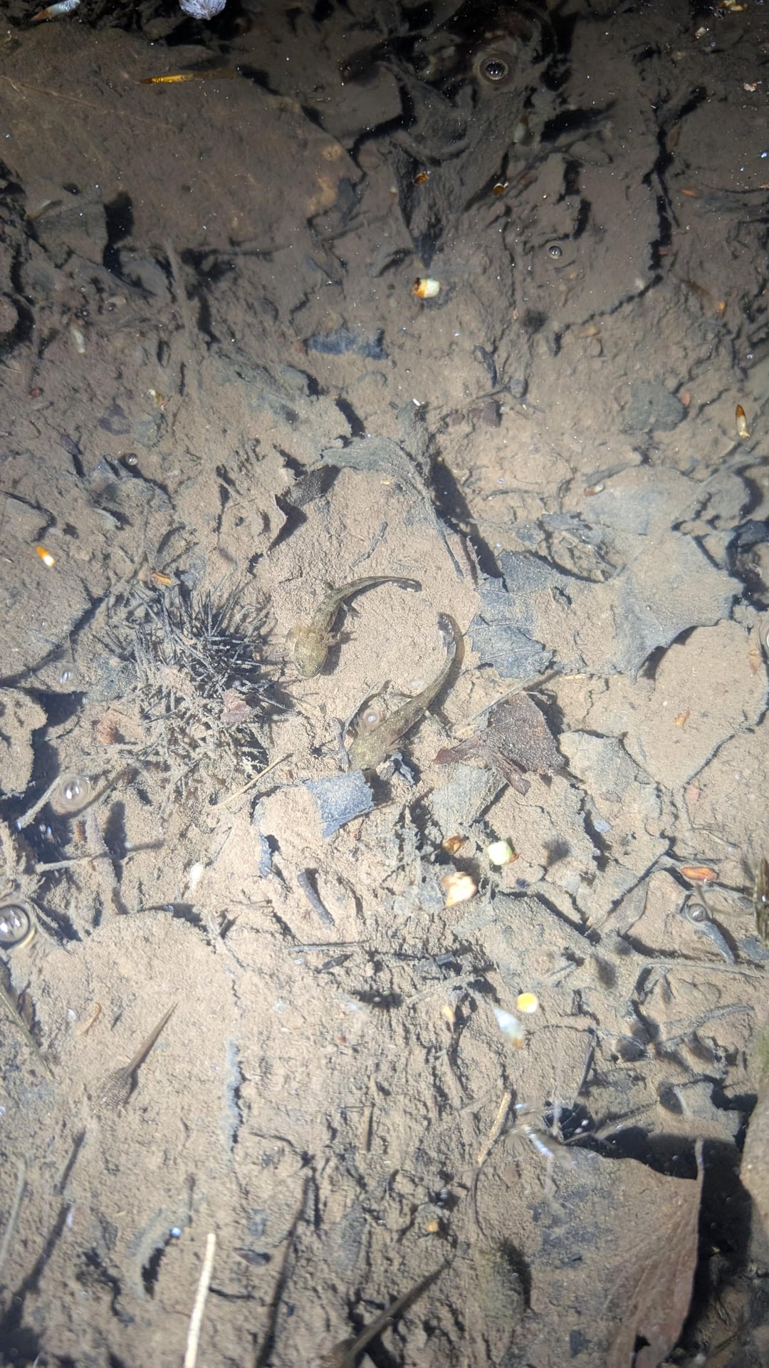 2 Feuersalamander Larven/unten links Grasfrosch Kaulquappen