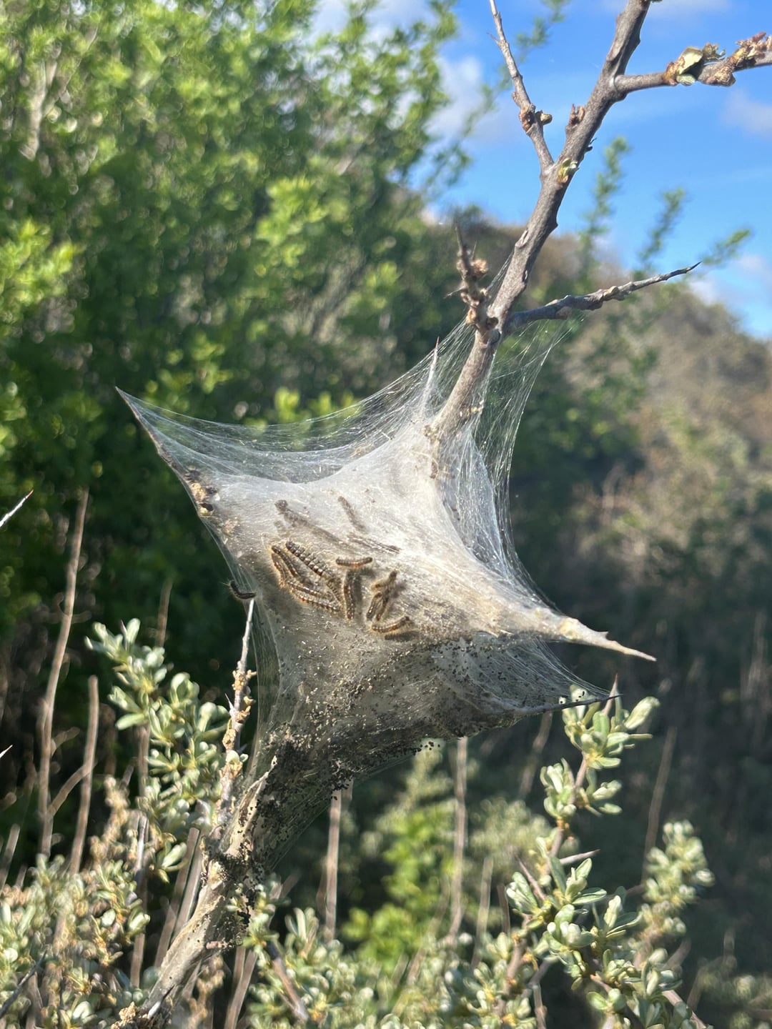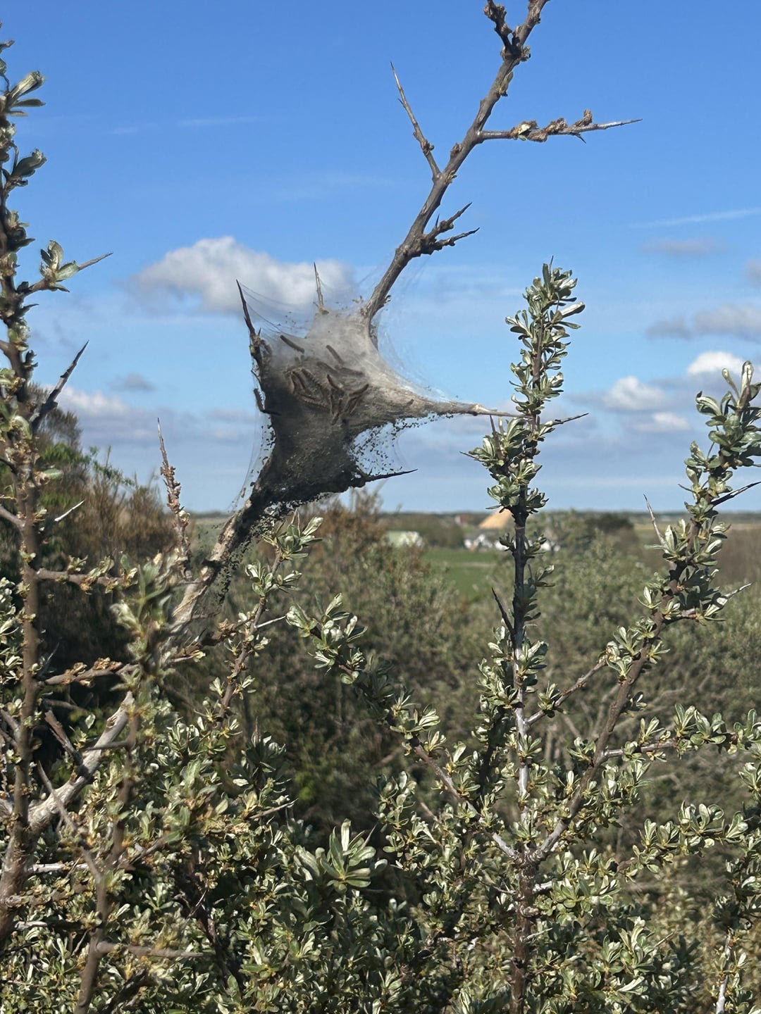 1. Diverse Wickler / Zünslerraupen, ich kann die Wirtspflanze nicht erkennen. Die machen diese Gespinste als Schutz gegen Freßfeinde.