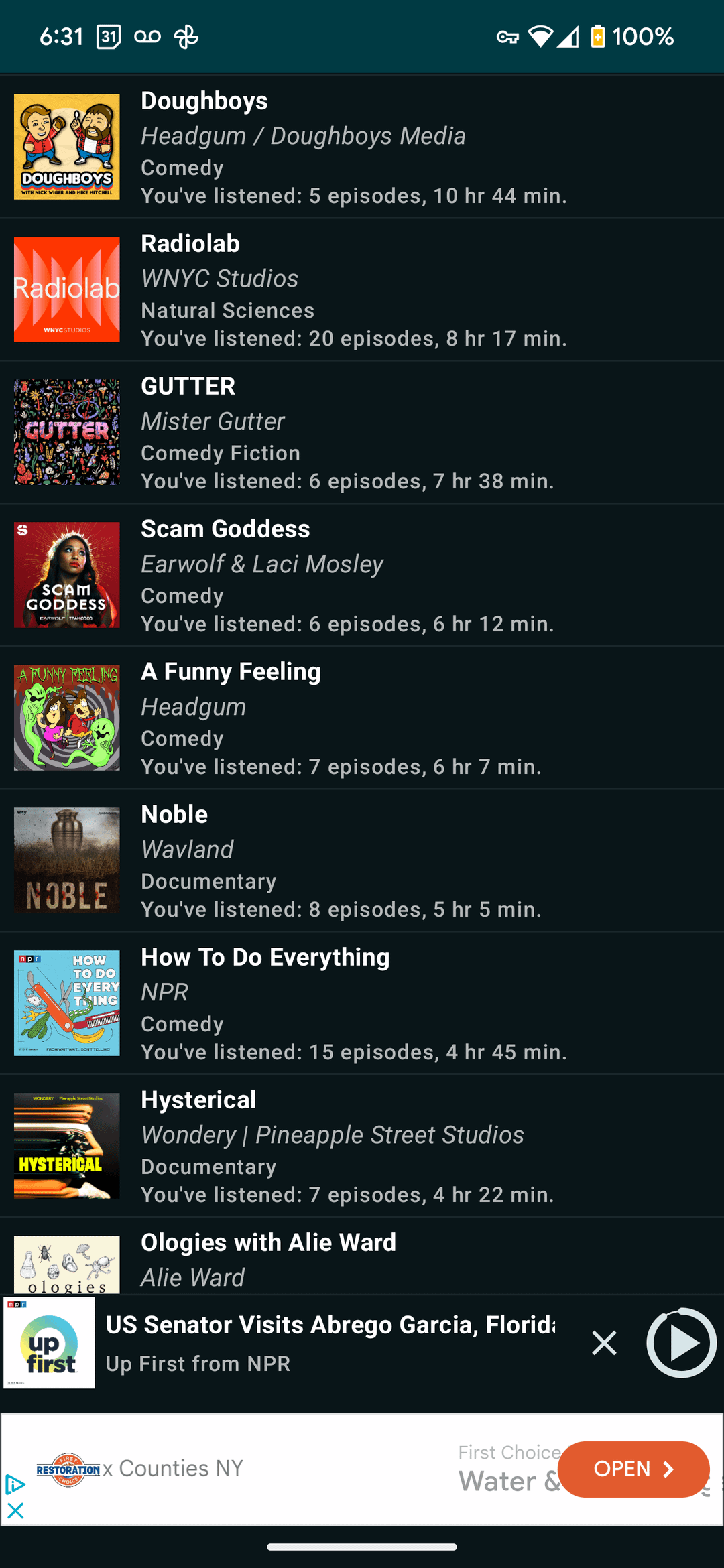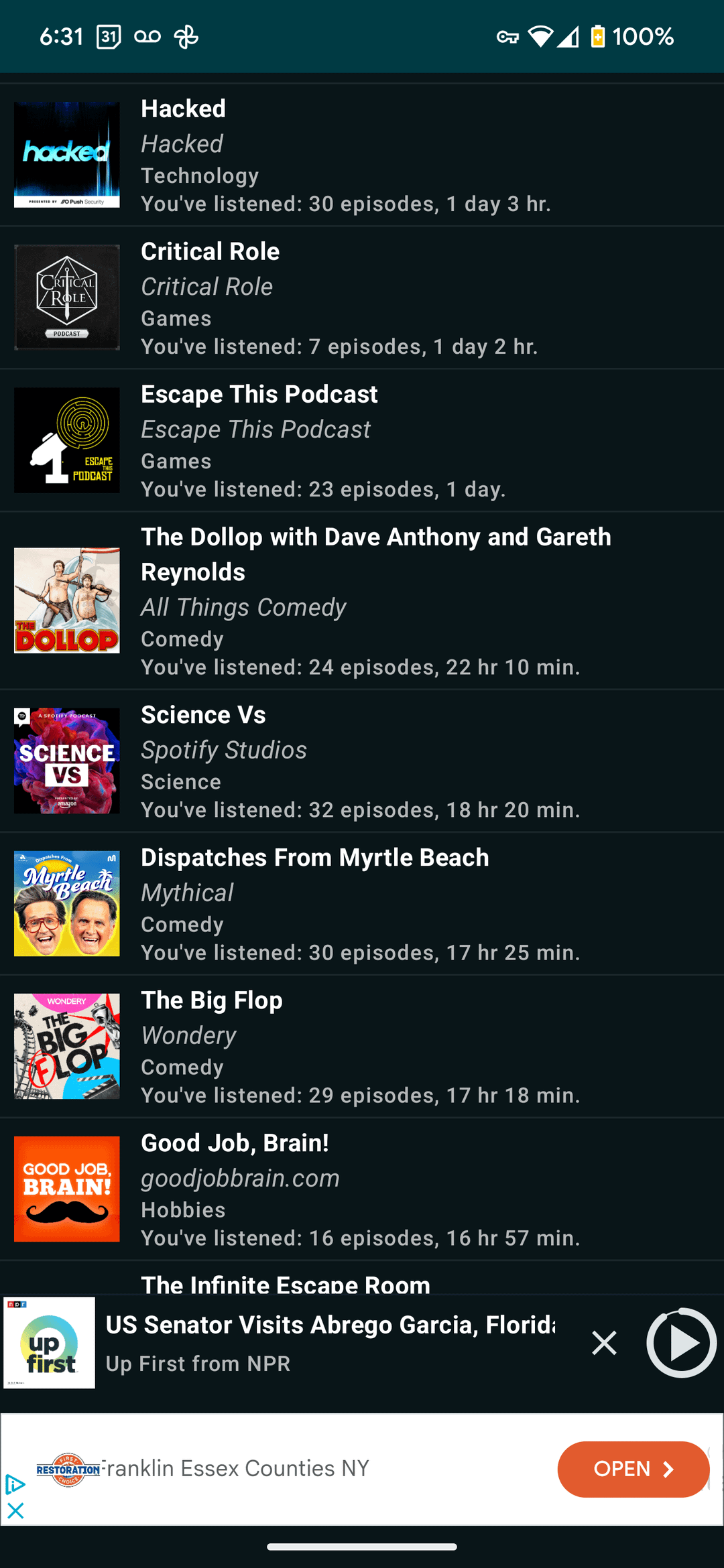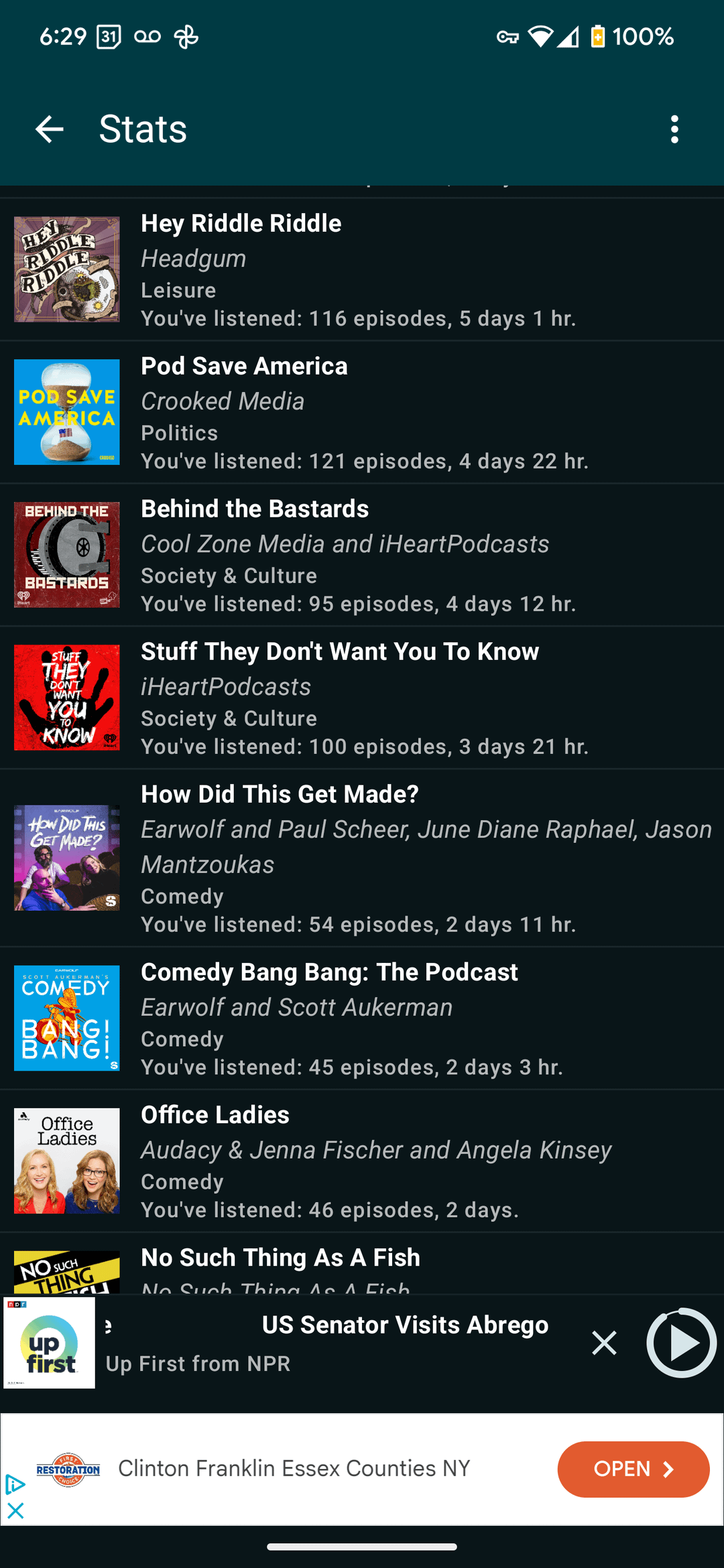 6. You listen to a lot of big name podcasts- I’ve probably at one point listened to at least one episode of 10 shows of your library, with Office Ladies and How did this get Made the only ones I used to regularly listen to (I put Office Ladies on hold till I do my next rewatch of later seasons). However the episodes I currently listen to regularly are a lot more niche than this. I use standard Apple Podcasts so I don’t know how to get stats.