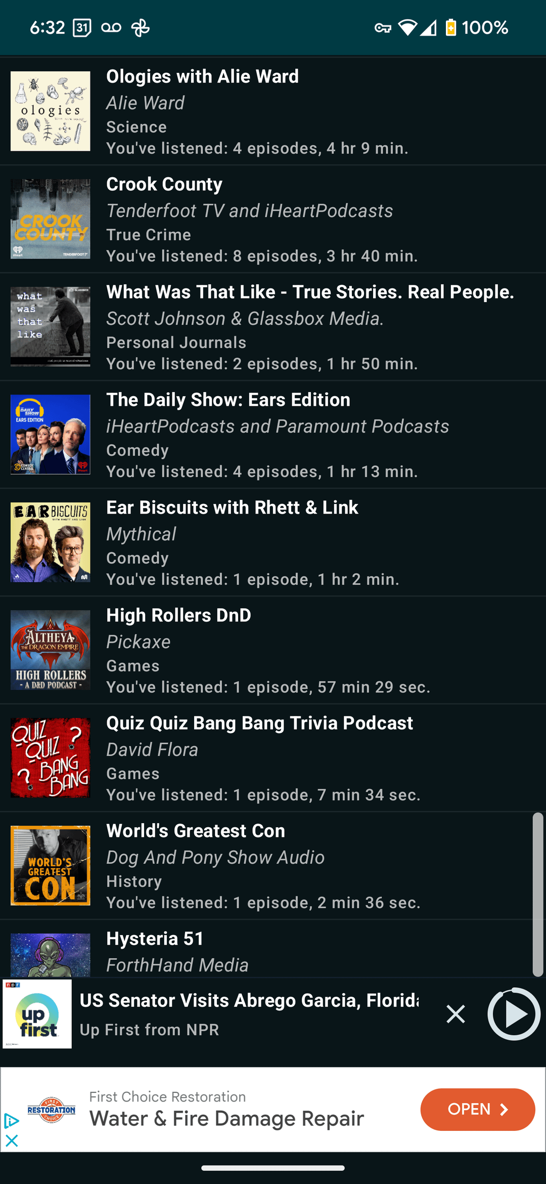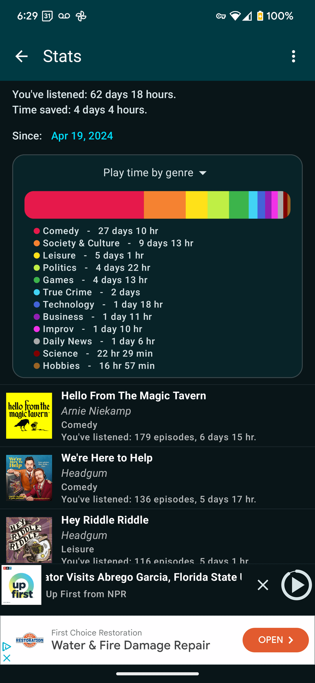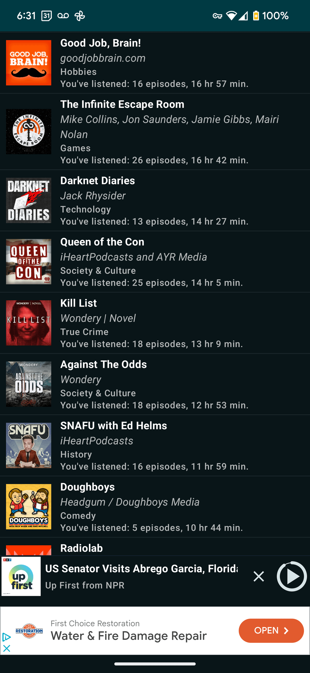 6. You listen to a lot of big name podcasts- I’ve probably at one point listened to at least one episode of 10 shows of your library, with Office Ladies and How did this get Made the only ones I used to regularly listen to (I put Office Ladies on hold till I do my next rewatch of later seasons). However the episodes I currently listen to regularly are a lot more niche than this. I use standard Apple Podcasts so I don’t know how to get stats.