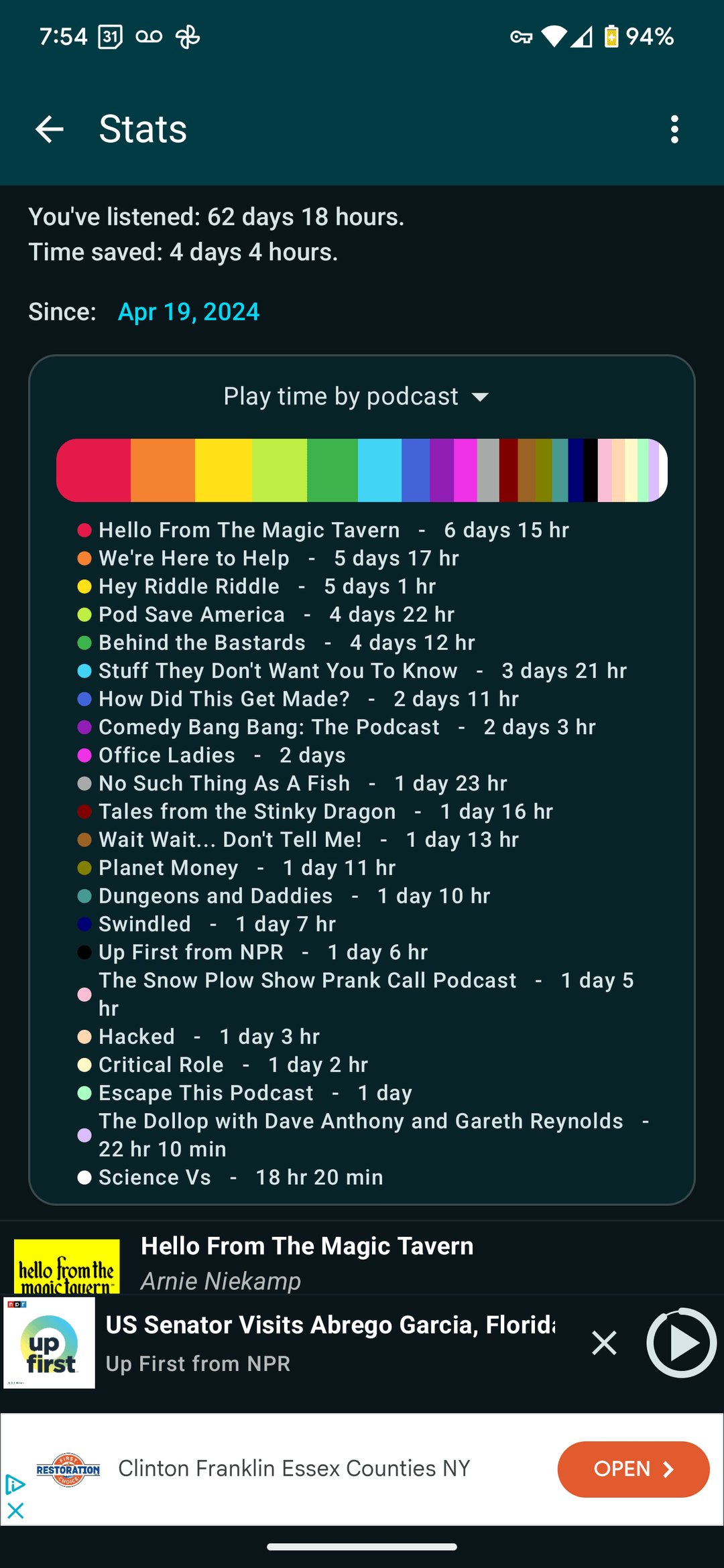 In the last year I have listening to over 62 days worth of podcast, and saved over 4 days just skipping ads 45 seconds at a time.