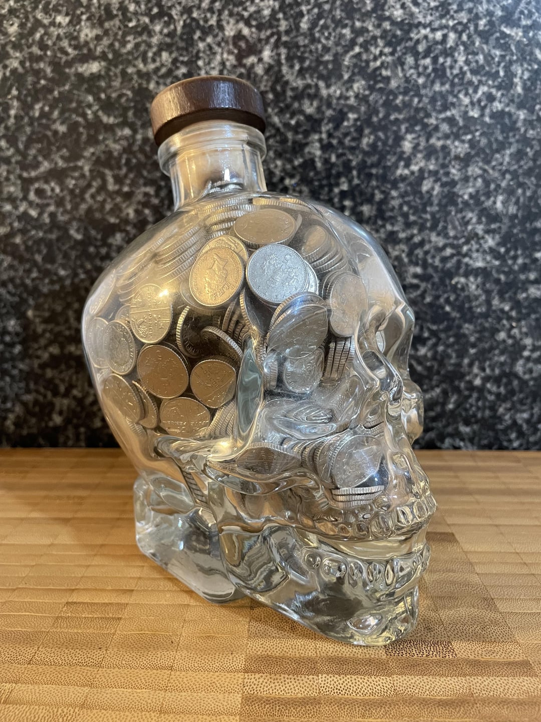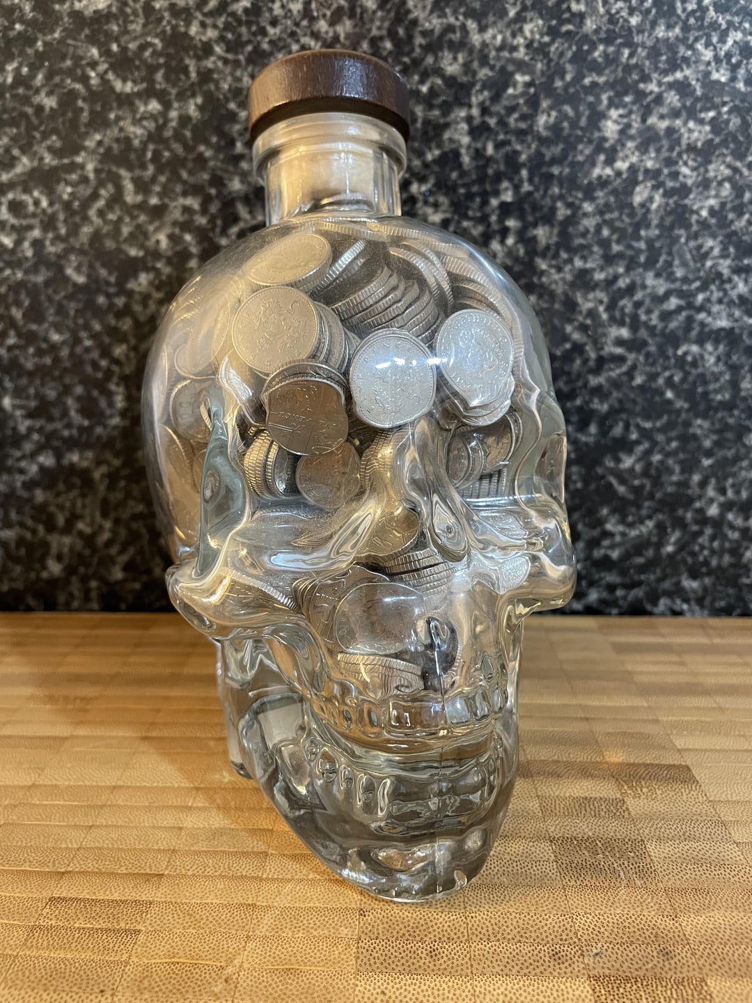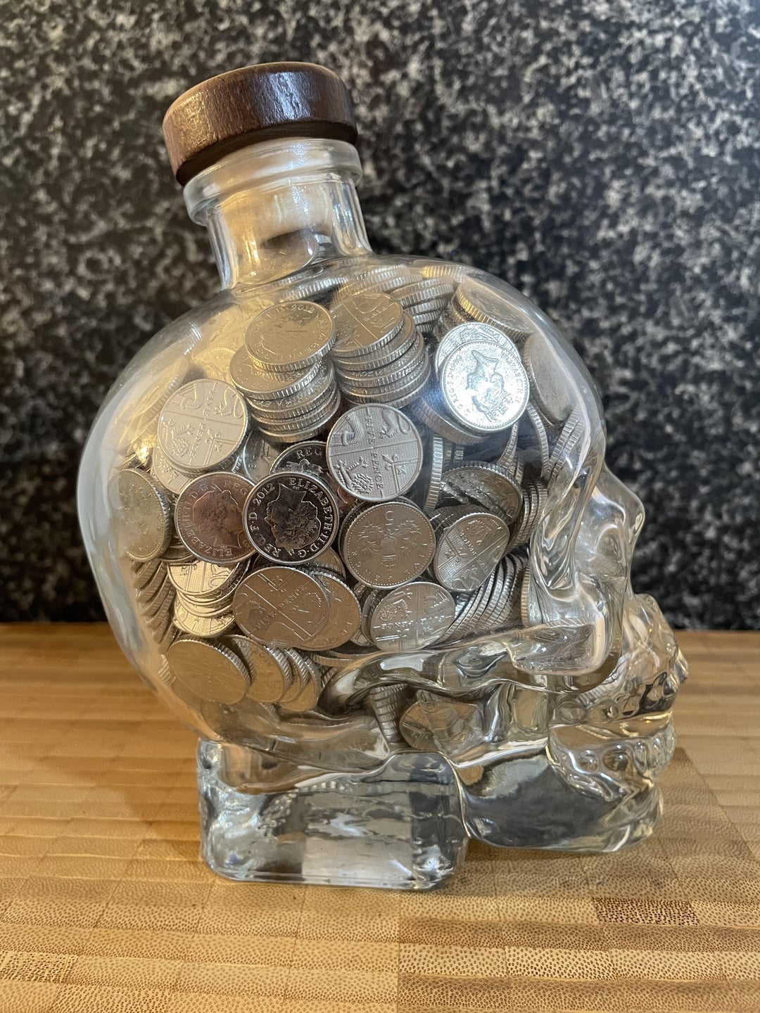 I’ve been using a Crystal Skull Vodka bottle to collect 5ps for over a decade. Today I finally finished. How much do you think is in it?