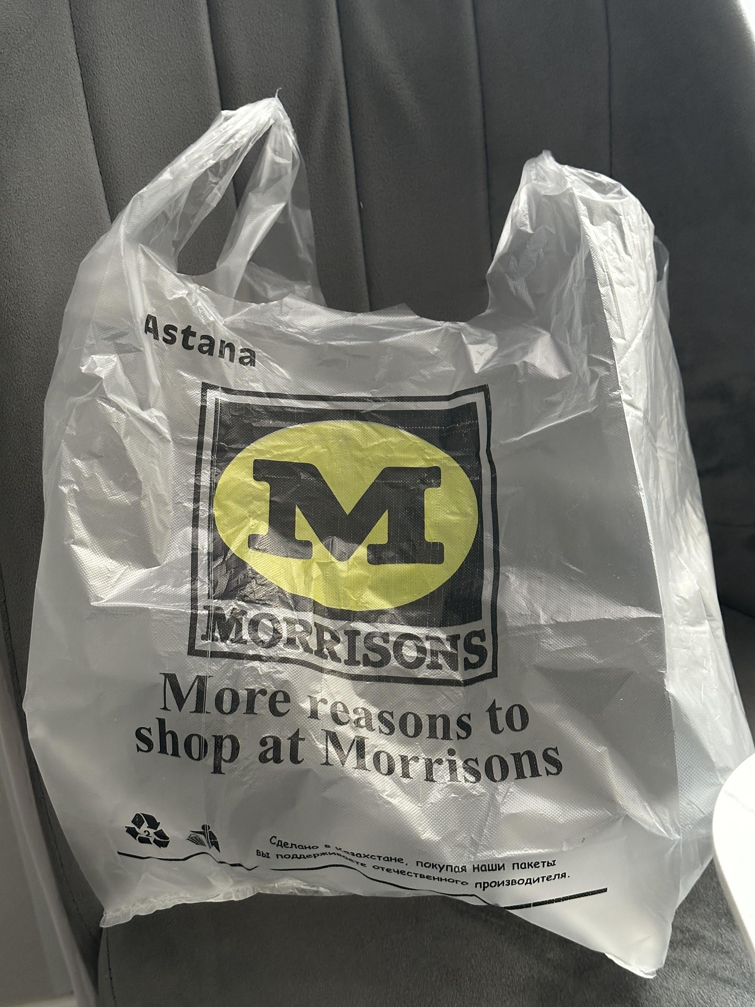 Originally I thought it might be old stock which was “recycled” by Morrisons, then I noticed the Astana branding at the top left, and Cyrillic text at the bottom. Anybody got an explanation for why shops here would be using carrier bags with an outdated logo, over 4000km from the nearest Morrisons?