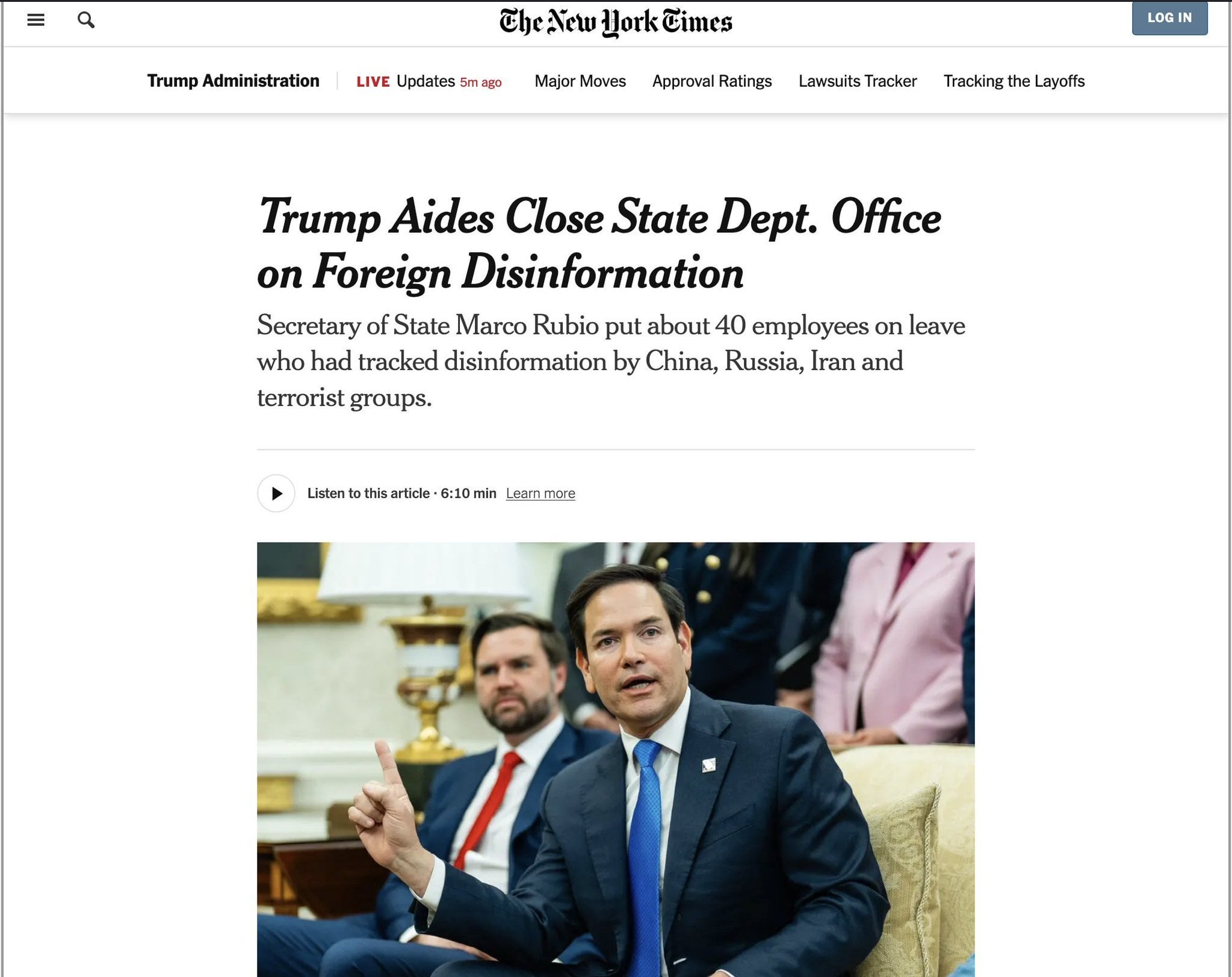 Trump’s team sides with Russia as they announced the closure of the State Department’s Counter Foreign Information Manipulation & Interference (R/FIMI) office, which combats Russian disinformation. They say this will protect Americans “free speech.”