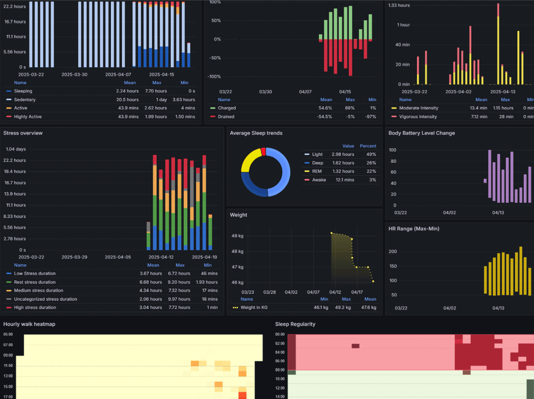 Feel free to give it a try and go through the setup process (relatively easy and detailed if you are familiar with Linux and Docker). You can fetch your old data from the Garmin connect server as well to visualize the trends on Grafana with this tool. It has already been tested by multiple users from r/Garmin community.