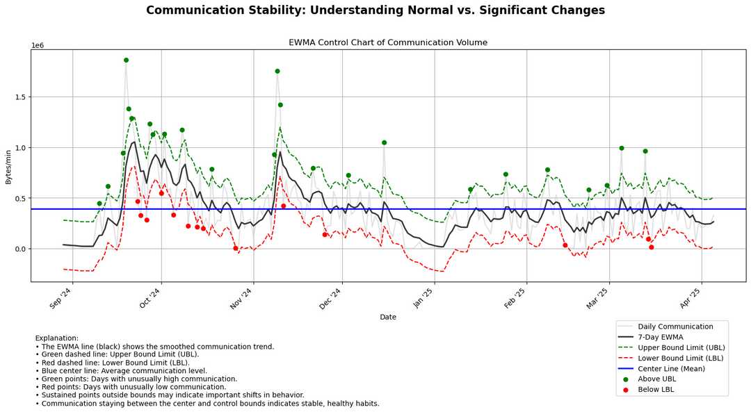 - EWMA Communication Stability chart which helps to track average vs outlier communication over time.