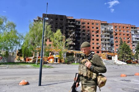 A Ukrainian soldier walks past damaged buildings in central Pokrovsk, the site of the heaviest battles with the Russian troops in the Donetsk region, Ukraine, Wednesday, April 23, 2025. (AP Photo/Michael Shtekel)