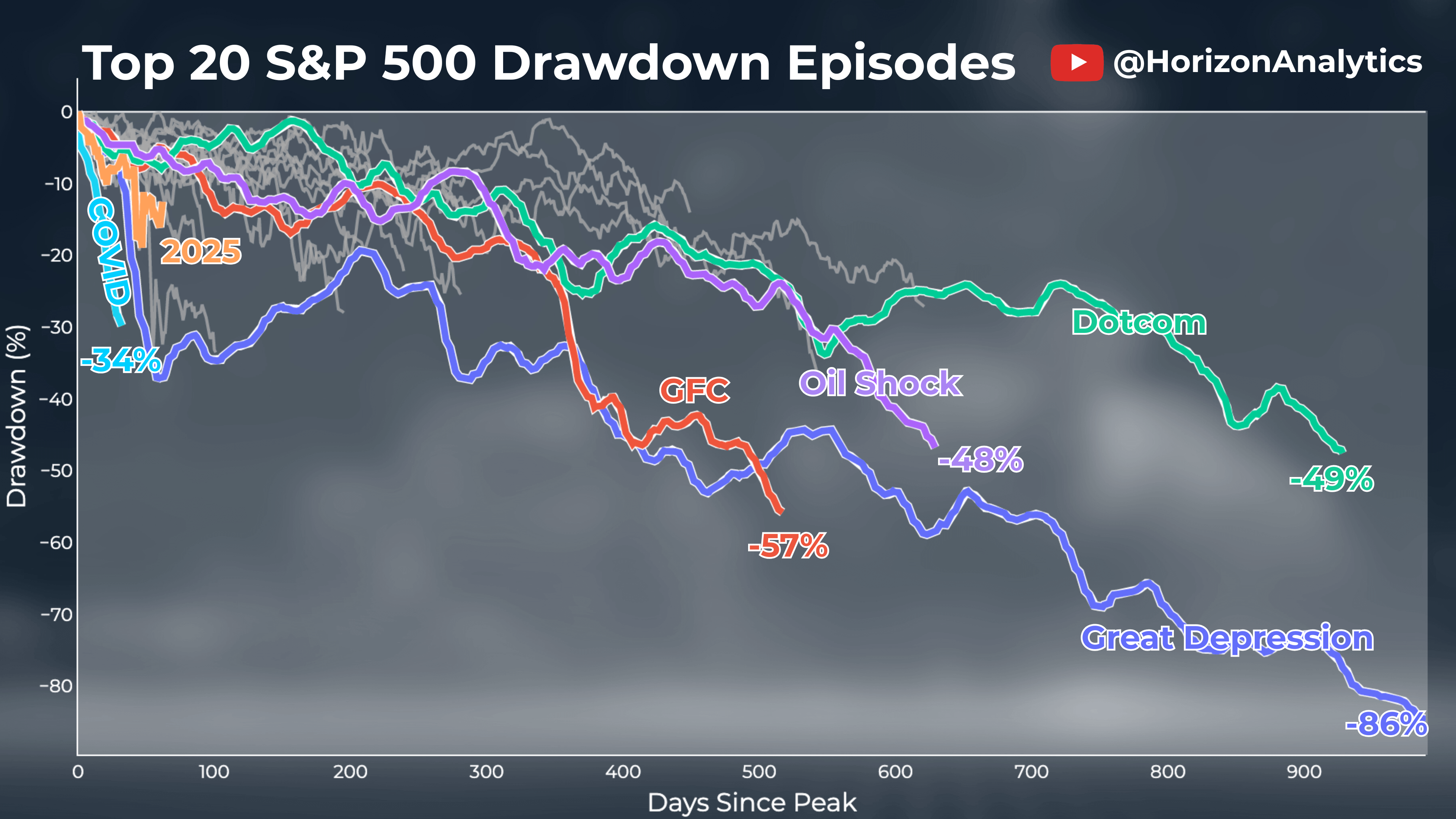 Highlighted drawdowns (Great Depression, GFC, Dotcom Bubble, Oil Shocks, Covid-19) have been smoothed. Grey lines show the rest of the top 20 drawdowns.