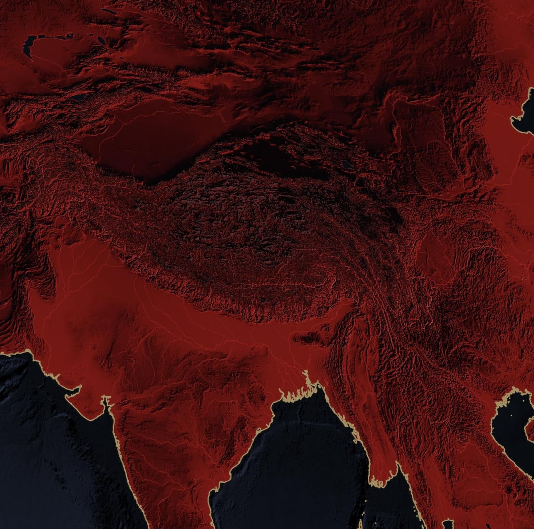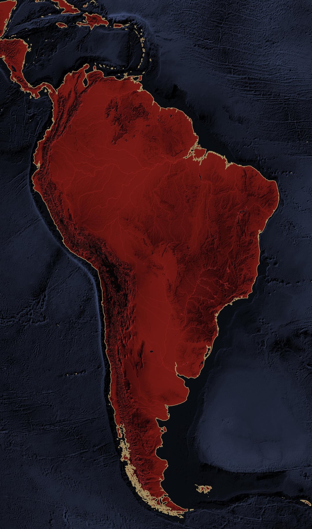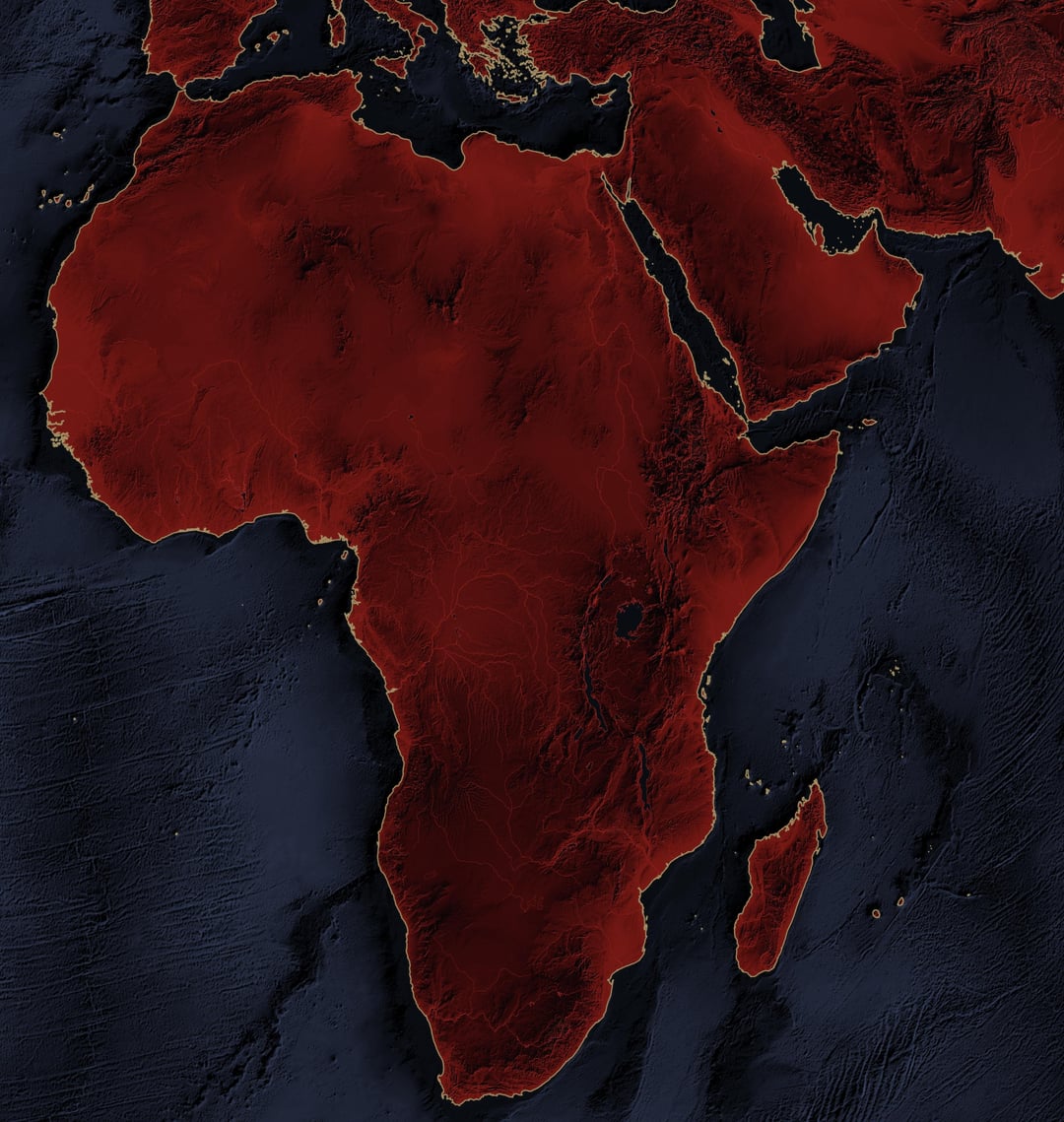 This map was created entirely from real geospatial data. The darker the red, the higher the elevation; the lighter the blue, the deeper the sea. You can see many fascinating details of Earth and its history: patterns of erosion, tiny fracture zones across ocean ridges, the outlines of tectonic plate, the curves mountain chains, and so on.