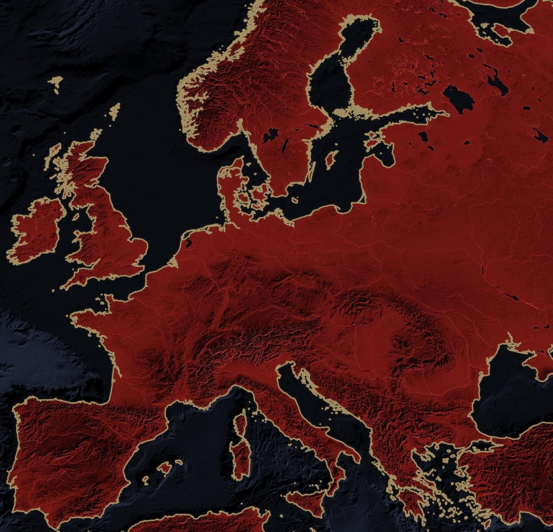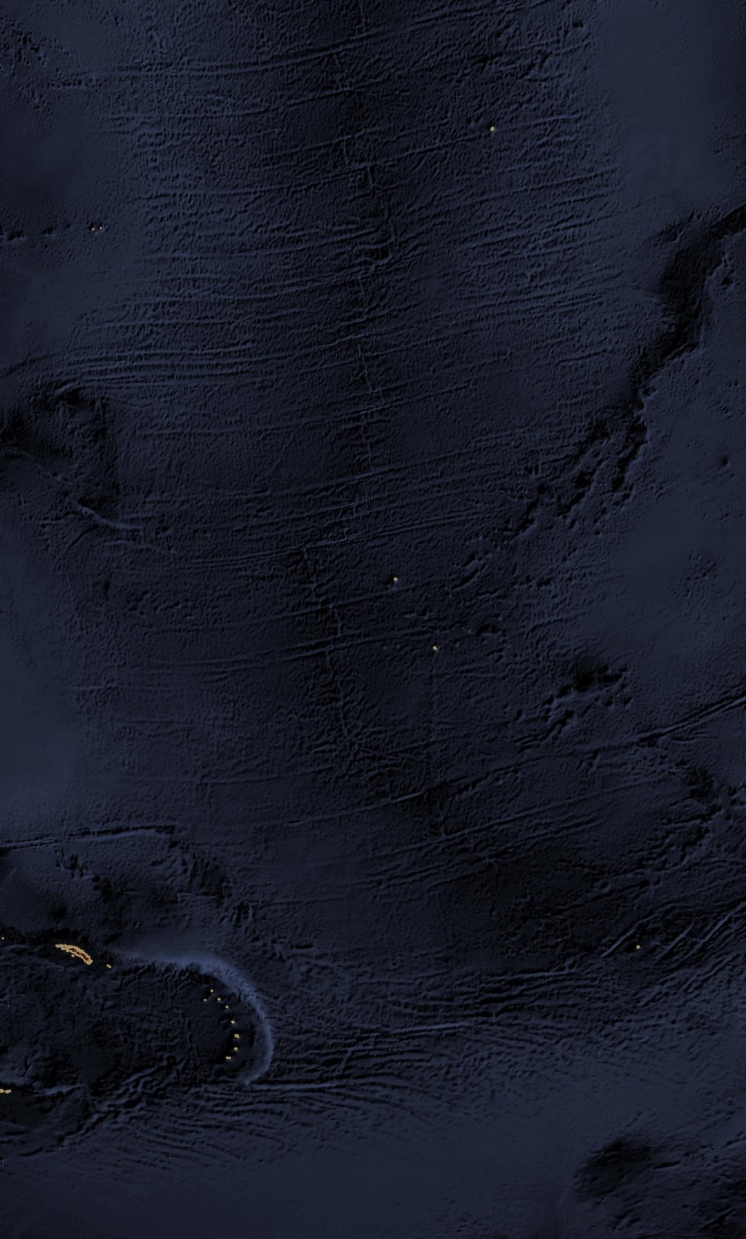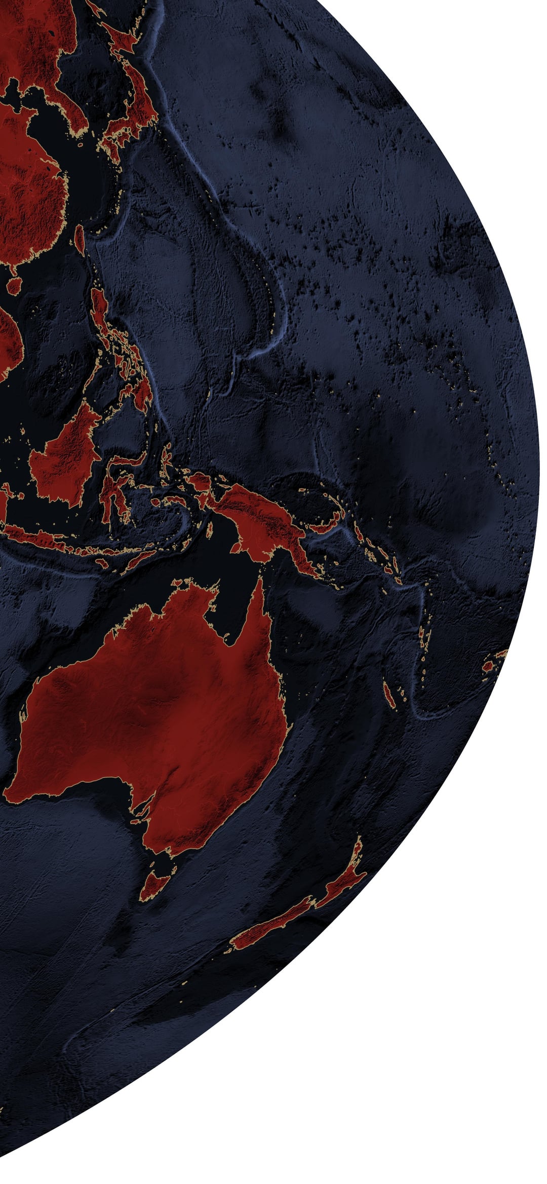 This map was created entirely from real geospatial data. The darker the red, the higher the elevation; the lighter the blue, the deeper the sea. You can see many fascinating details of Earth and its history: patterns of erosion, tiny fracture zones across ocean ridges, the outlines of tectonic plate, the curves mountain chains, and so on.