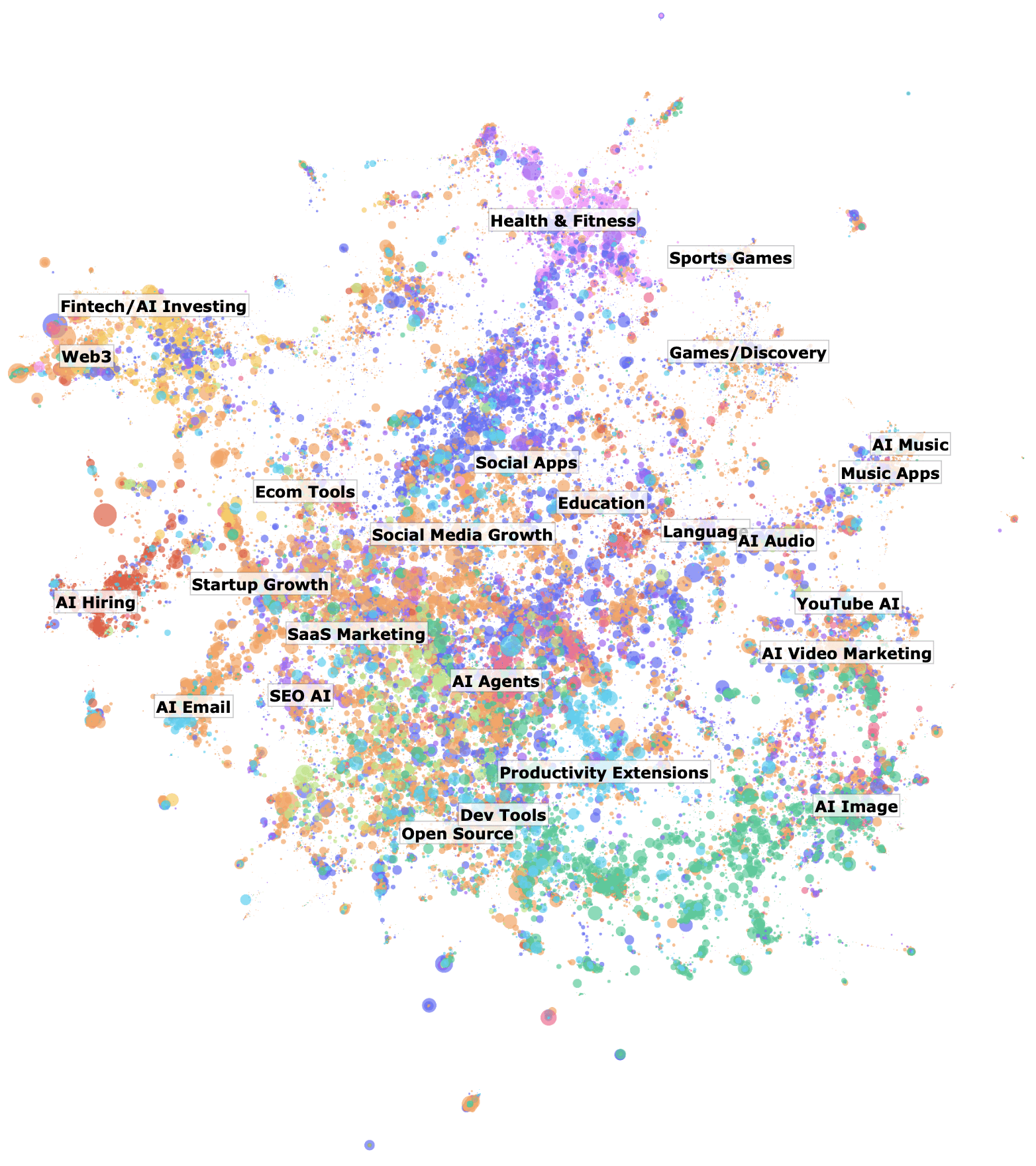 2. Visual looks cool…probably should add some context about what product hunt is (never heard of it until searched it just now), and maybe what you’re trying to convey with the visual (i.e. there are a lot of products around the X category)